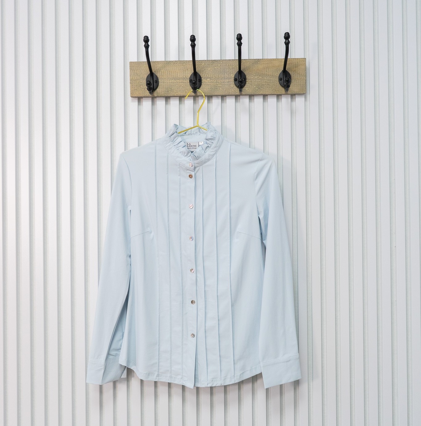 Elegante damesblouse van lichte, kreukvrije travelstof met een ruche langs de halslijn en fijne plooitjes op het voorpand. De soepele stof zorgt voor een comfortabele pasvorm en een stijlvolle, vrouwelijke look. Ideaal voor elke gelegenheid.