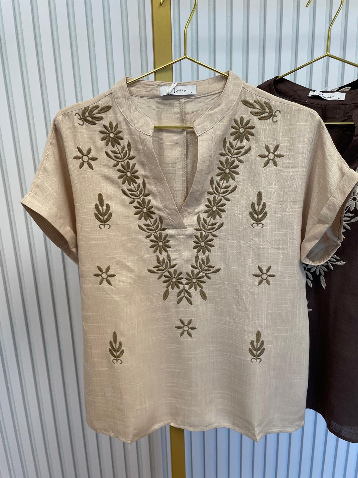 Deze blouse is zo leuk! Mooi, zomers en fris. Echt een eyecatcher! Gemaakt in linnenlook stof met mooi borduursel op het voorpand. Een veelzijdige blouse die heerlijk draagt en perfect is voor elke dag.
