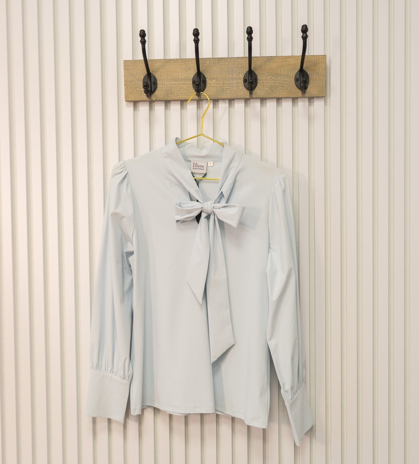 Chique damesblouse van elastische, kreukvrije travelstof met een vrouwelijke strik in de hals, brede manchetten en een gerimpelde mouw. De soepele stof en elegante details geven de blouse een stijlvolle, moderne uitstraling.