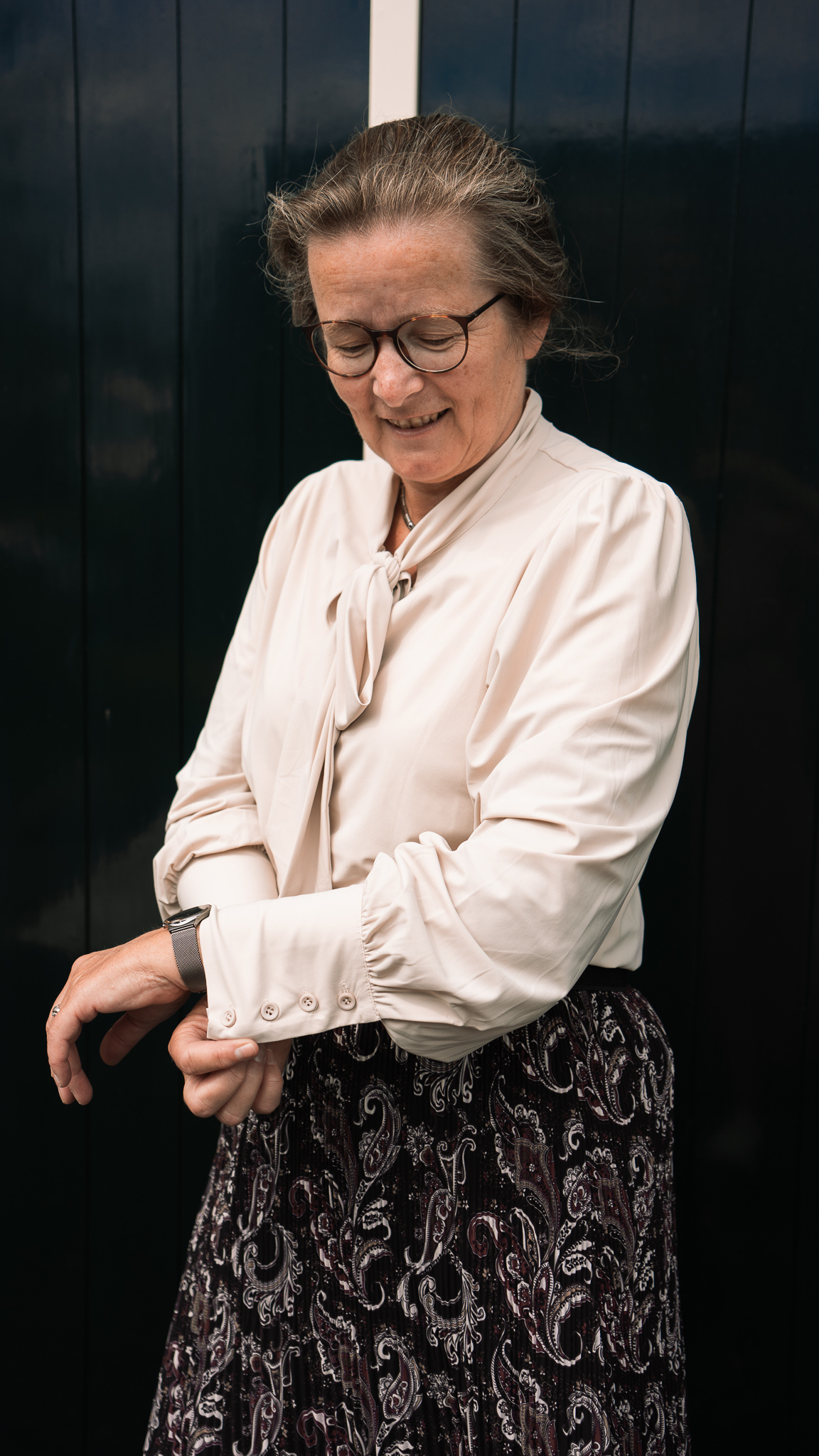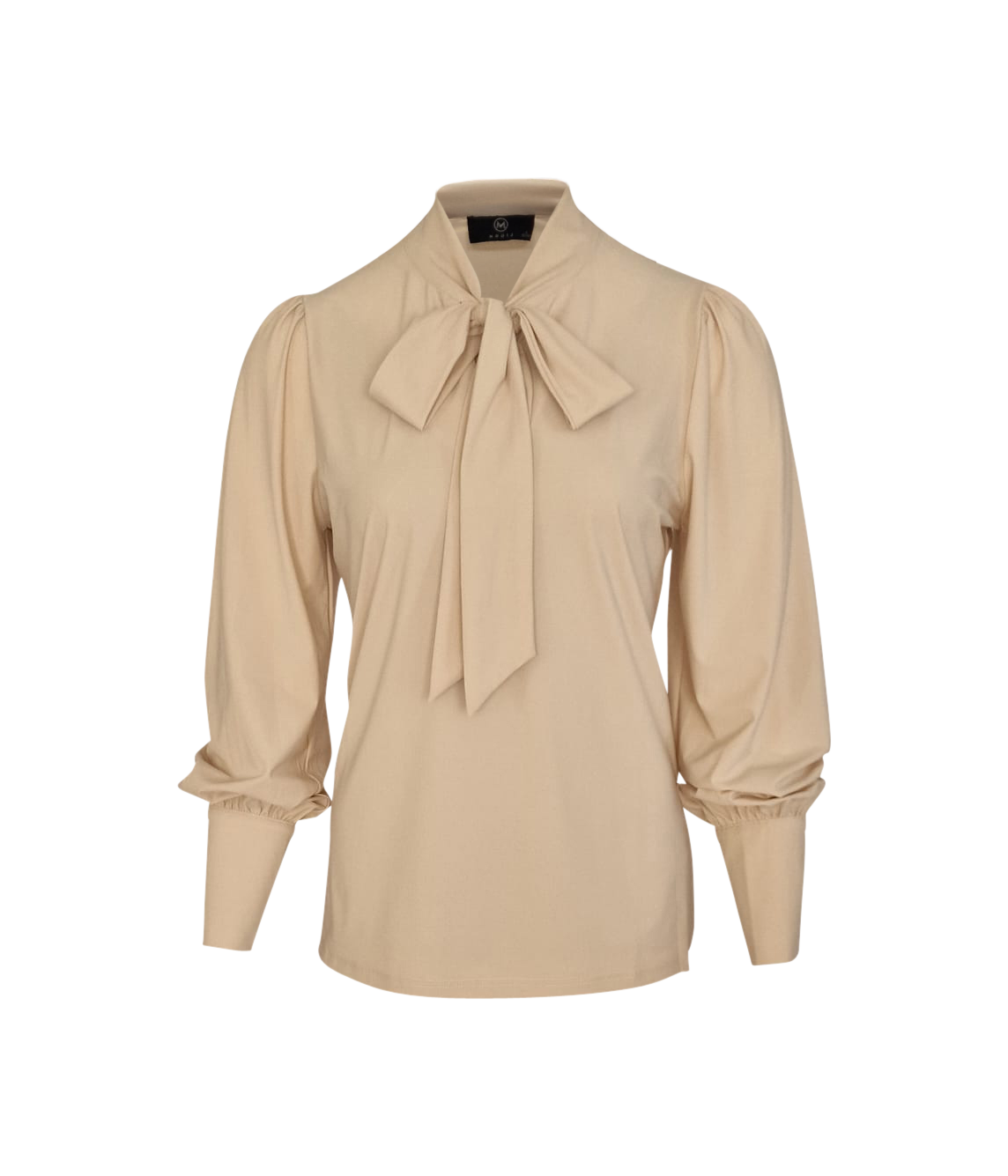 Damesblouse in travelstof met knoopsluiting. De blouse heeft een opstaand boordje en striksluiting en aan de mouwen brede manchetten met knoopjes. De blouse heeft een mooie uitstraling. De blouse is niet alleen chique maar draagt ook heel fijn!
