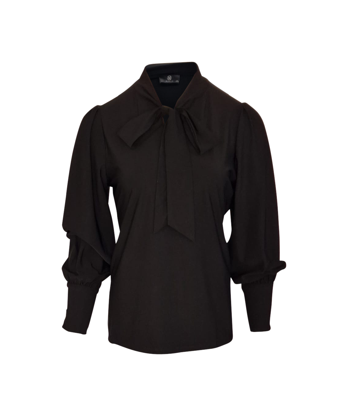 Damesblouse in travelstof met knoopsluiting. De blouse heeft een opstaand boordje en striksluiting en aan de mouwen brede manchetten met knoopjes. De blouse heeft een mooie uitstraling. De blouse is niet alleen chique maar draagt ook heel fijn!