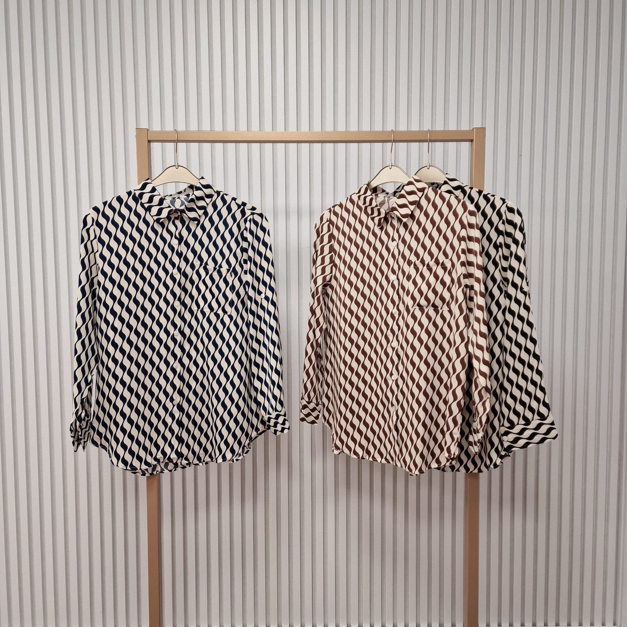 Deze klassieke blouse in marine/beige is een absolute must-have in elke garderobe. Dankzij de stijlvolle kraag, doorknoopsluiting en lange mouw is dit item geschikt om zo te dragen of te combineren met een jasje, vest of trui.