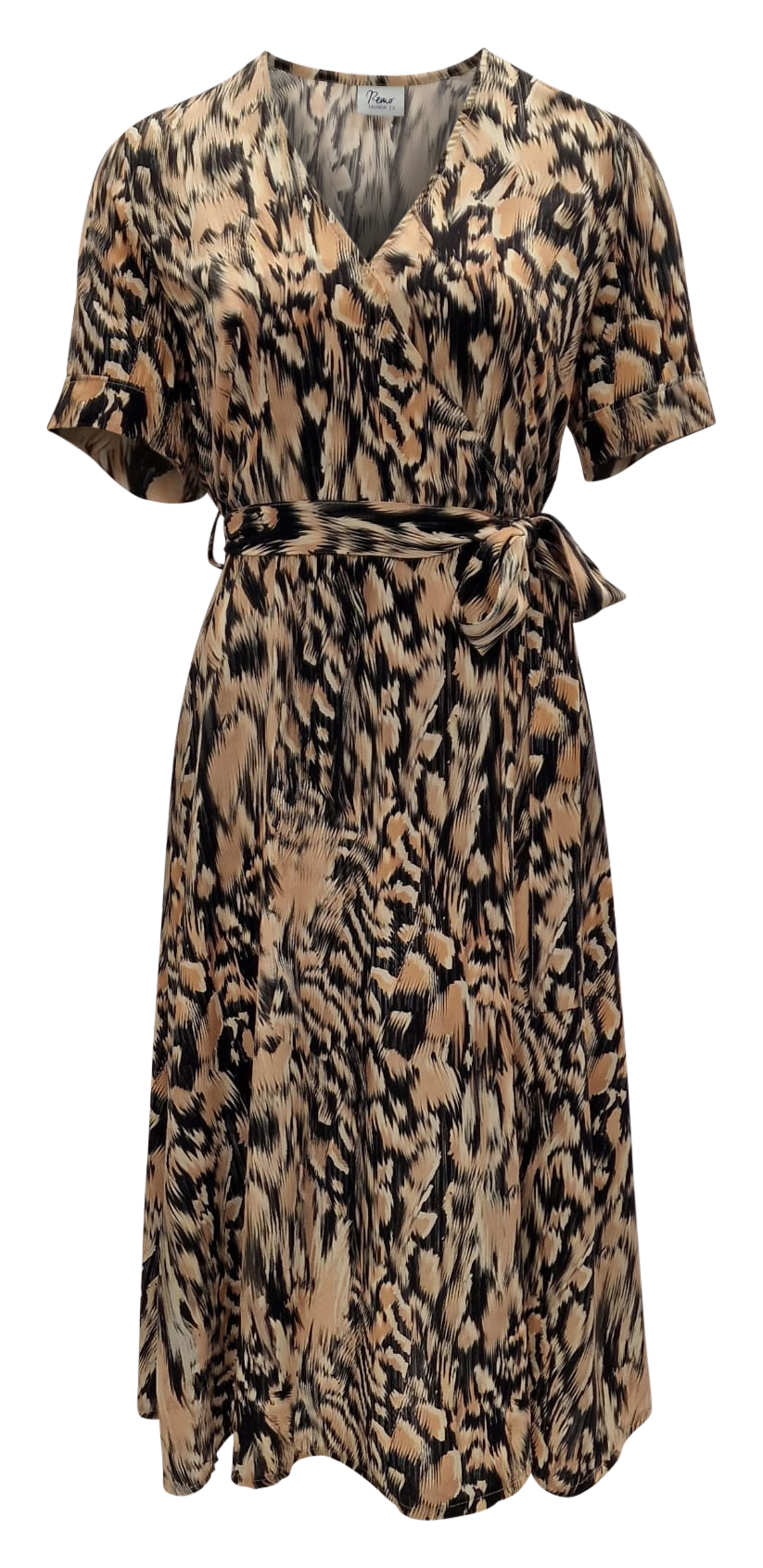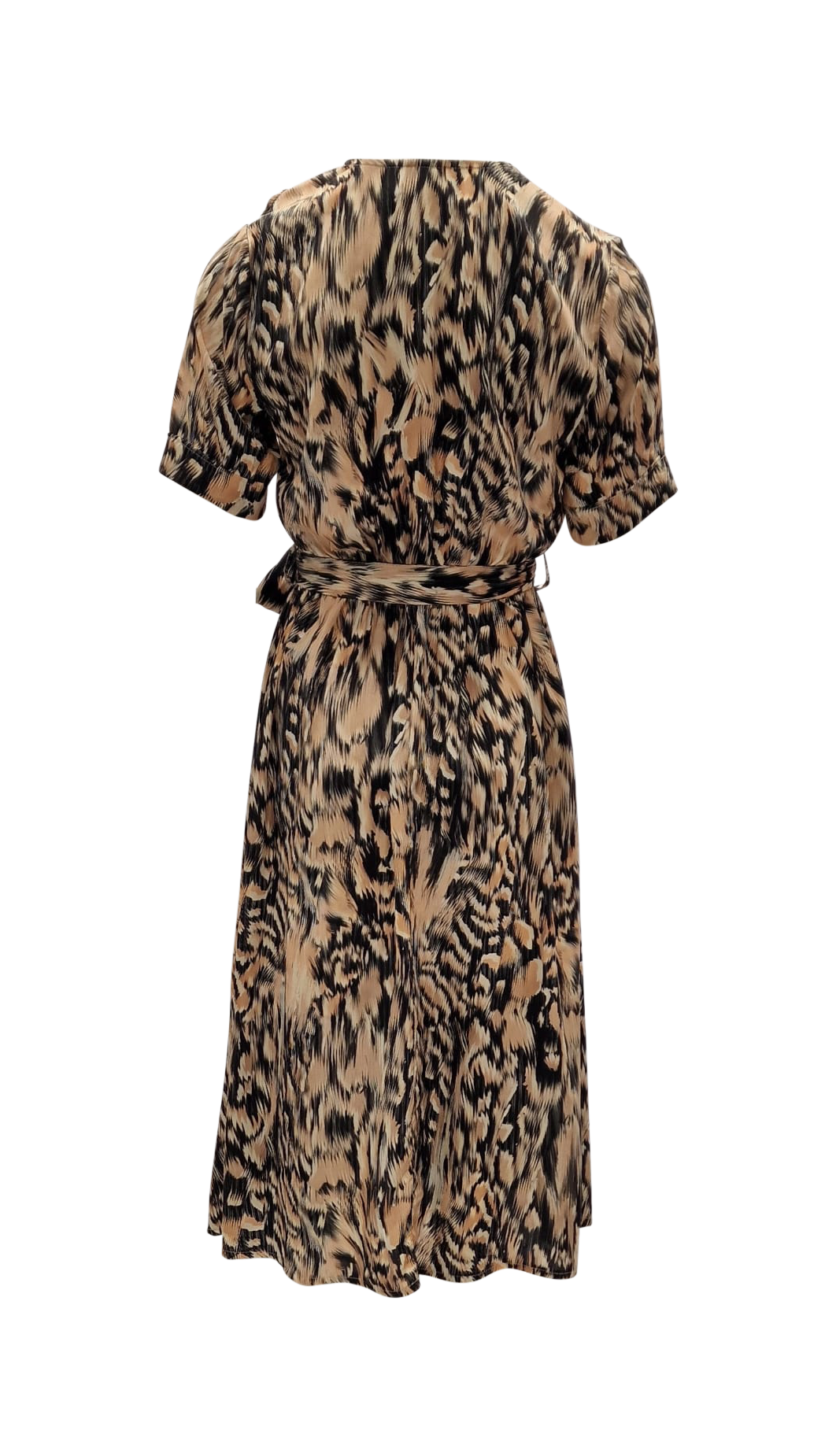 Mooie damesjurk met een V-hals, strikceintuur in een uitlopend model. De korte mouwen zijn afgewerkt met een boordje. Soepel vallende stof van 100% viscose.