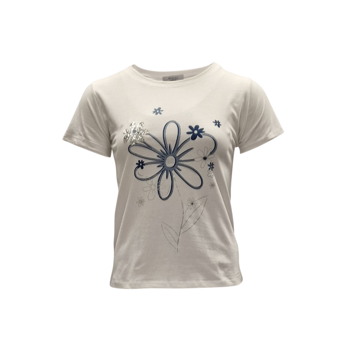 Dames shirt met ronde hals en korte mouw in wit voorzien van een mooie bloemapplicatie in blauw. Een fijn zomers item in zachte tricot.