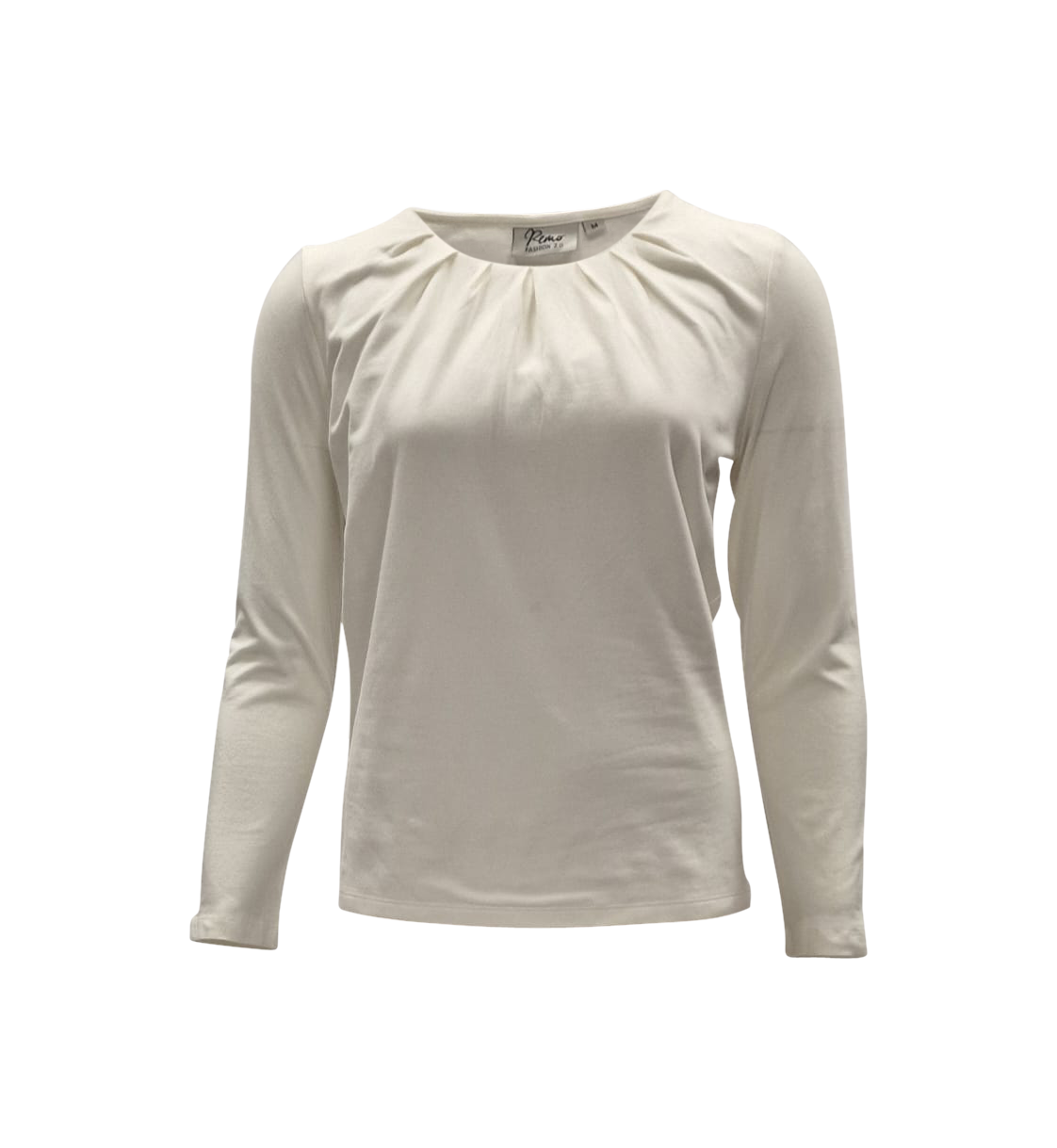 Dames shirt met lange mouw en plooitjes langs de ronde halslijn biedt talloze stylingmogelijkheden. Het shirt is gemaakt van 95% katoen en 5% elastan wat zorgt voor een fijn draagcomfort.