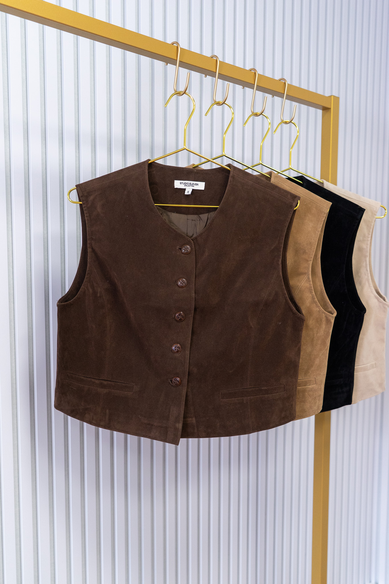 Stijlvol mouwloos gilet in een luxe suède-look. Het gilet is licht getailleerd, heeft een ronde hals, een knoopsluiting aan de voorzijde en twee subtiele steekzakken. Een makkelijk te combineren item over een shirt, blouse of jurk.