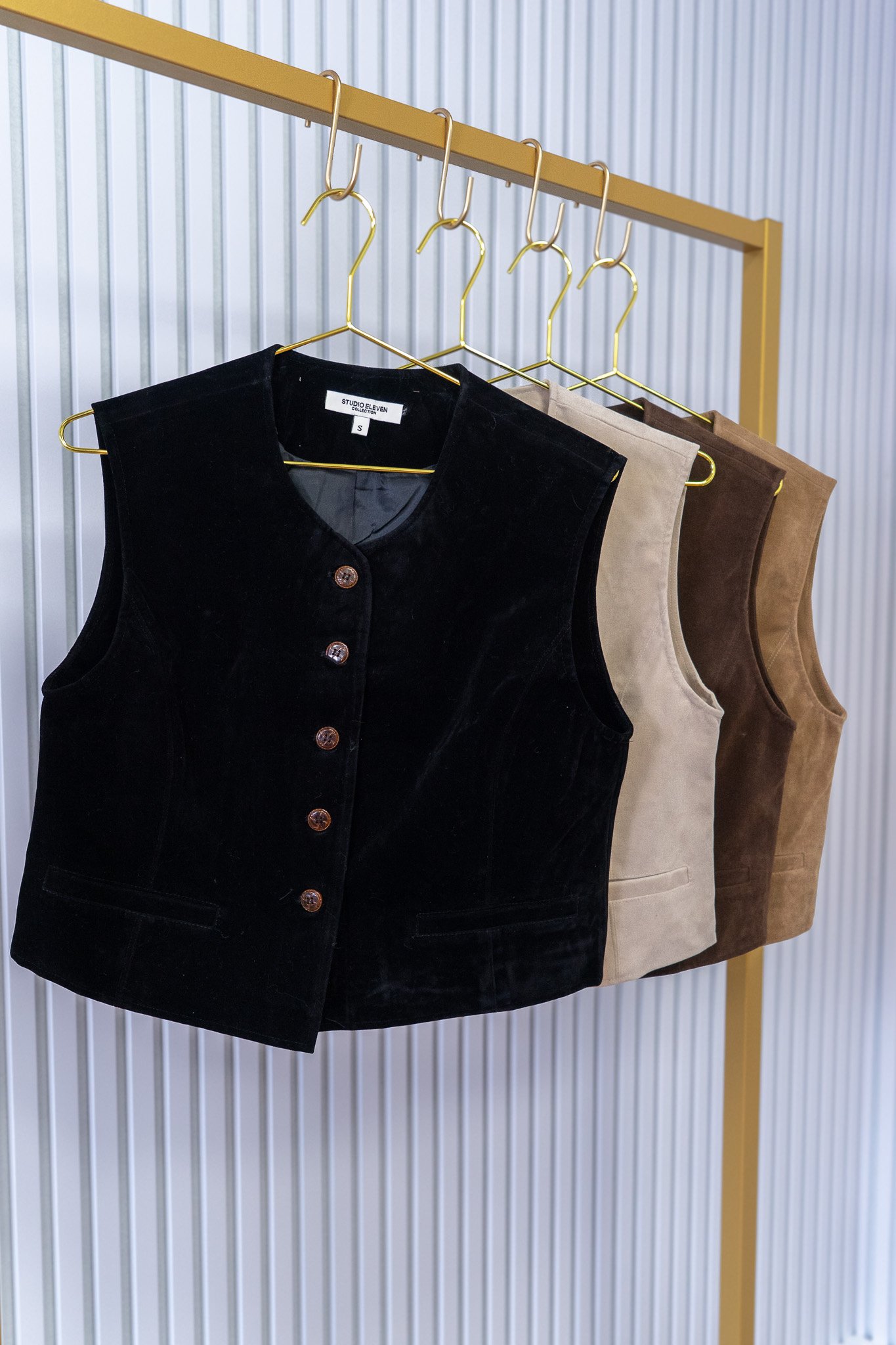 Stijlvol mouwloos gilet in een luxe suède-look. Het gilet is licht getailleerd, heeft een ronde hals, een knoopsluiting aan de voorzijde en twee subtiele steekzakken. Een makkelijk te combineren item over een shirt, blouse of jurk.