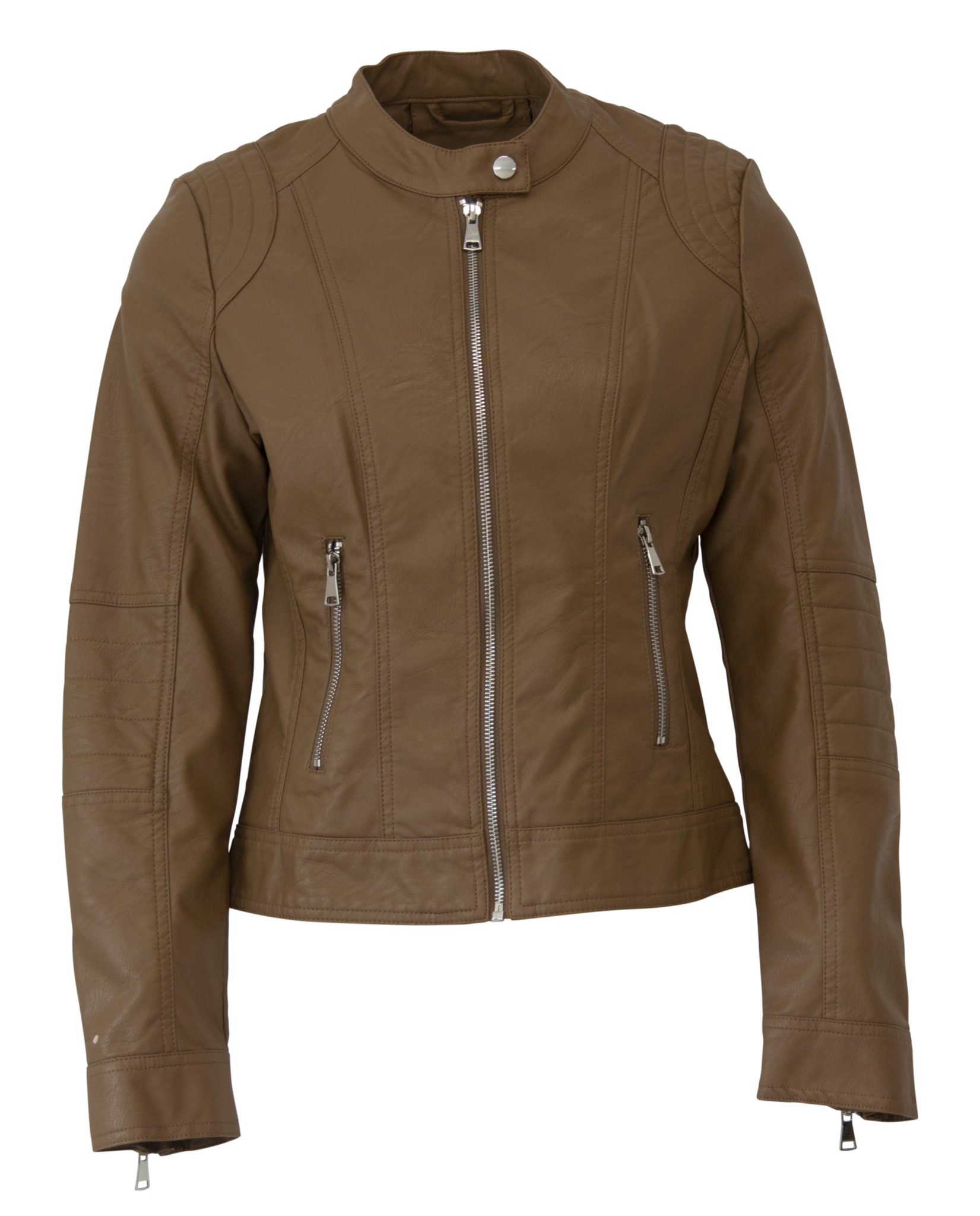 Sportief dames jasje in leatherlook. Het jasje heeft leuke details door de stiksel en ritsen.