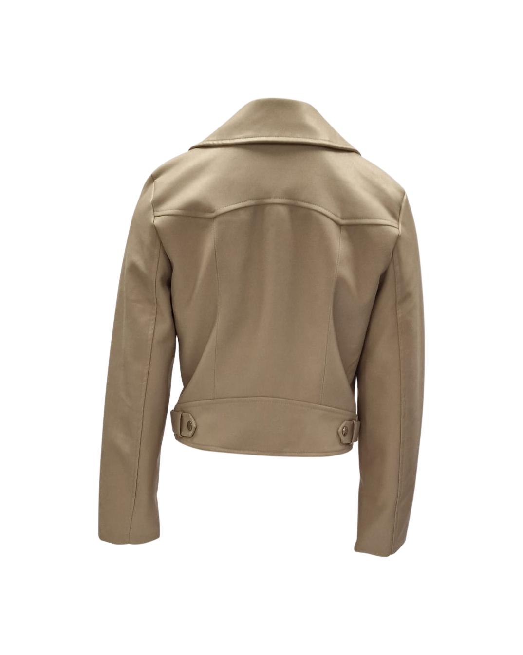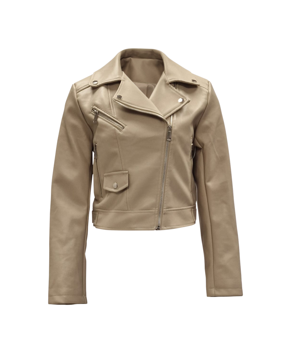 Sportief dames jasje in leatherlook. Het jasje heeft aan de voor- en achterkant leuke details zoals een kraag, drukknopen, schuine rits en een klepzakje.