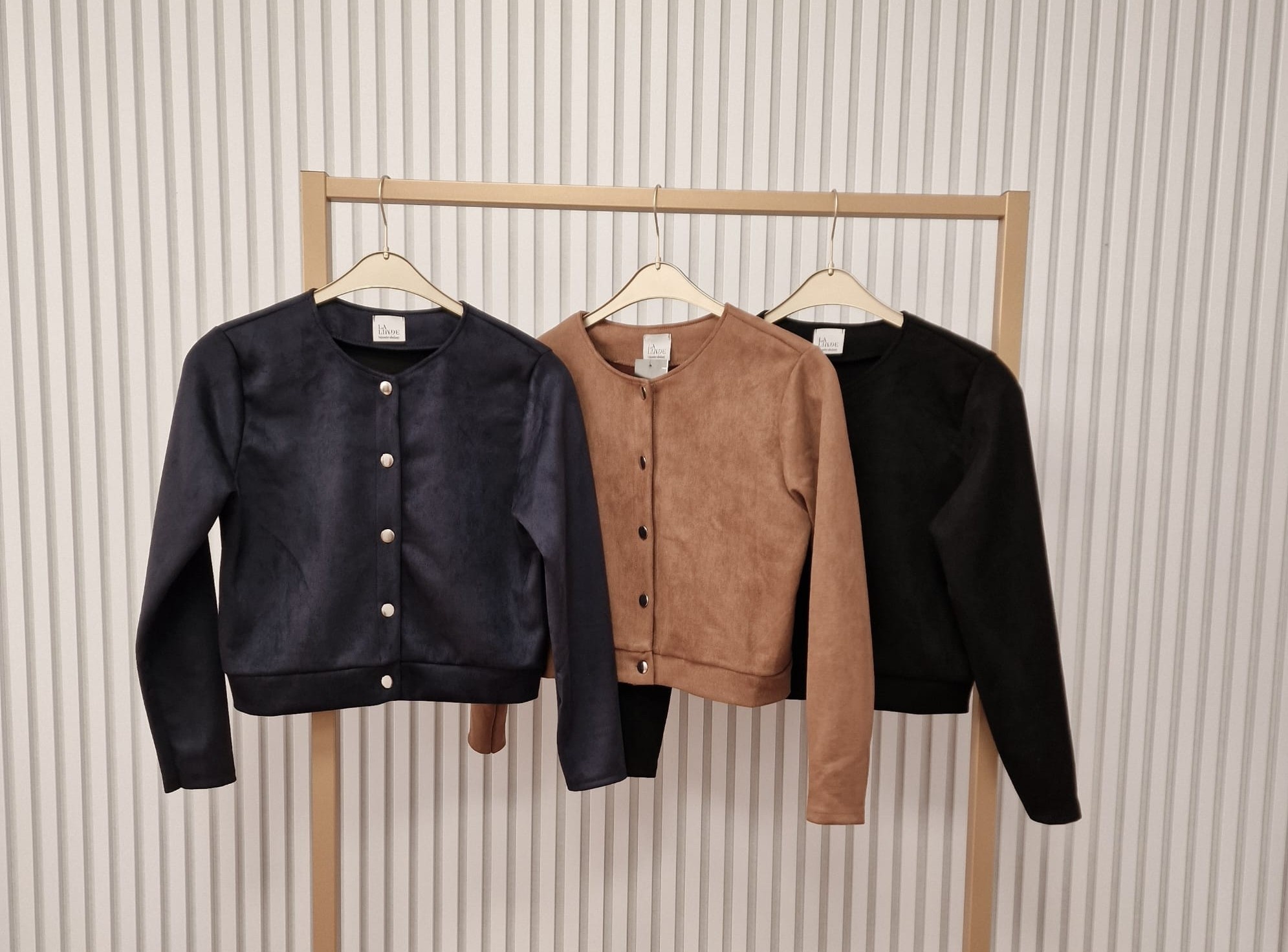 Damesjasje met ronde hals, voorzien van een sluiting met zilverkleurige knopen. Het jasje is uitgevoerd in een heerlijke zachte stof met een suède look en is afgewerkt met een boord aan de onderkant voor een elegante en comfortabele pasvorm.