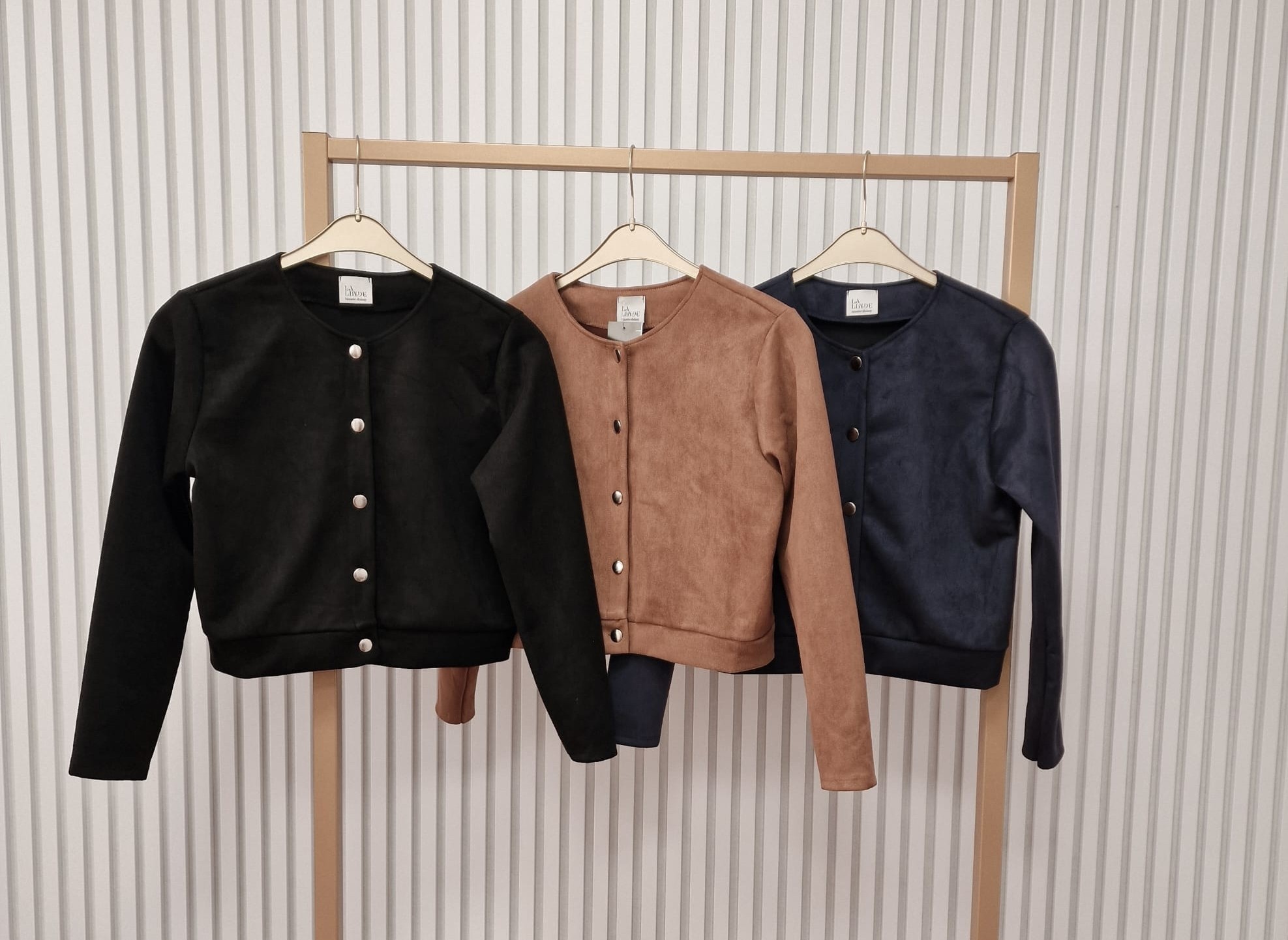Damesjasje met ronde hals, voorzien van een sluiting met zilverkleurige knopen. Het jasje is uitgevoerd in een heerlijke zachte stof met een suède look en is afgewerkt met een boord aan de onderkant voor een elegante en comfortabele pasvorm.