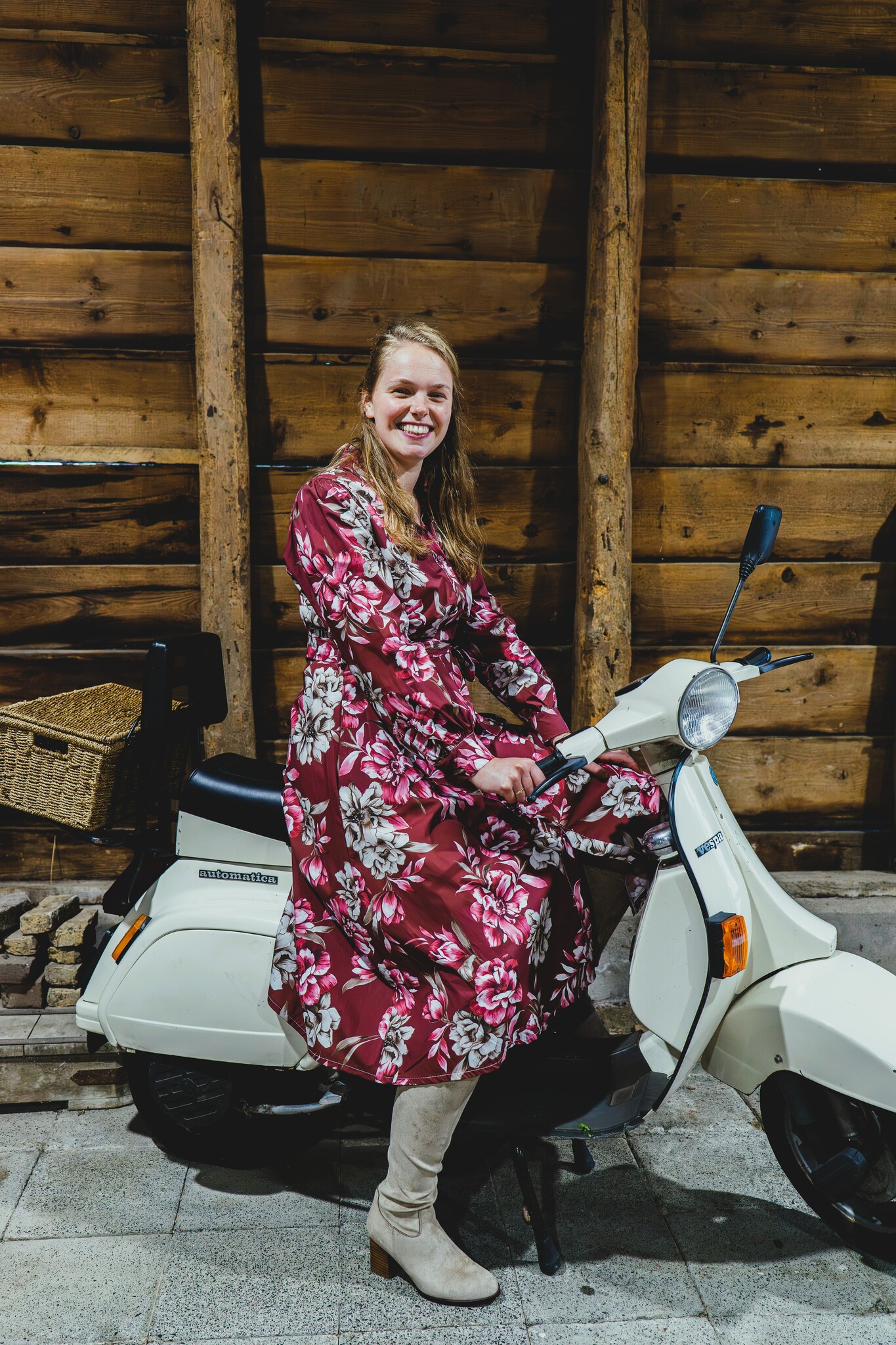 Deze lange doorknoopjurk is een echte blikvanger. Vanuit de taille loopt de rok mooi uit. De jurk is afgewerkt met een subtiel boordje en verfijnde ruches. Perfect om zowel casual met sneakers als stijlvol met hakken te dragen.