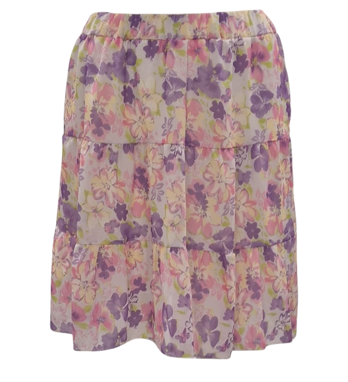 Jonge dames rok in soepele stof met vrolijk bloemdessin en drie stroken. De rok heeft een elastische tailleband en voorzien van een voering. Leuk te combineren met diverse tops en shirts uit onze collectie.