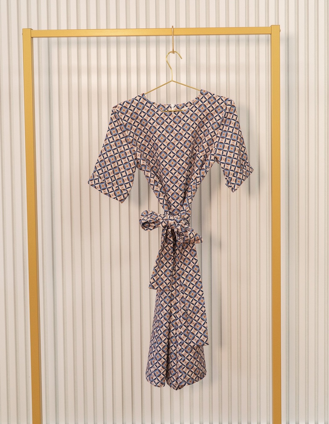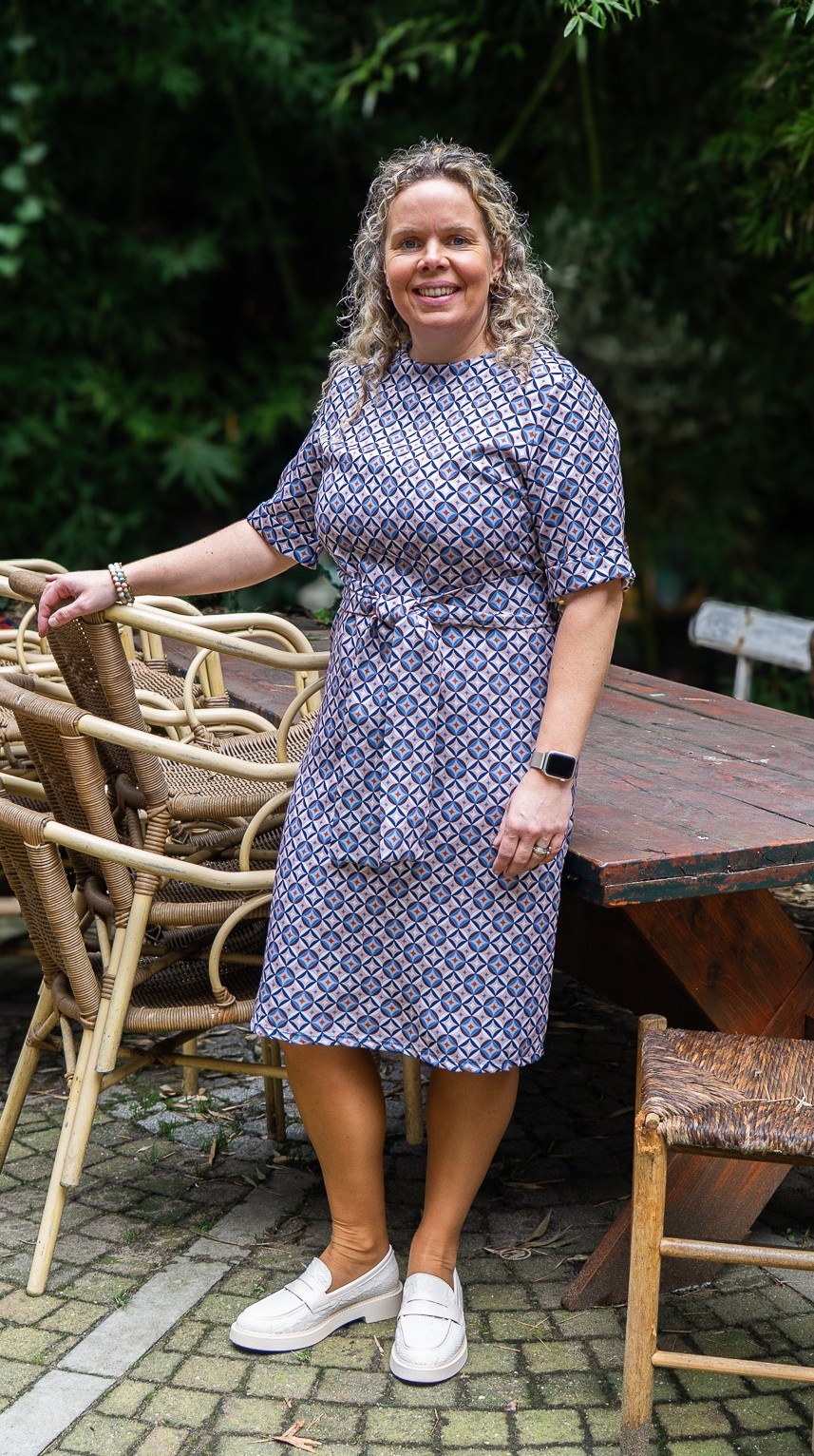 Een elegante jurk in een recht model met een ronde hals en korte mouwen met gerimpelde schouders. De jurk sluit middenachter met een rits en heeft een strikceintuur in dezelfde stof. Een stijlvolle jurk, voor zowel dagelijks als feestelijke gelegenheden.