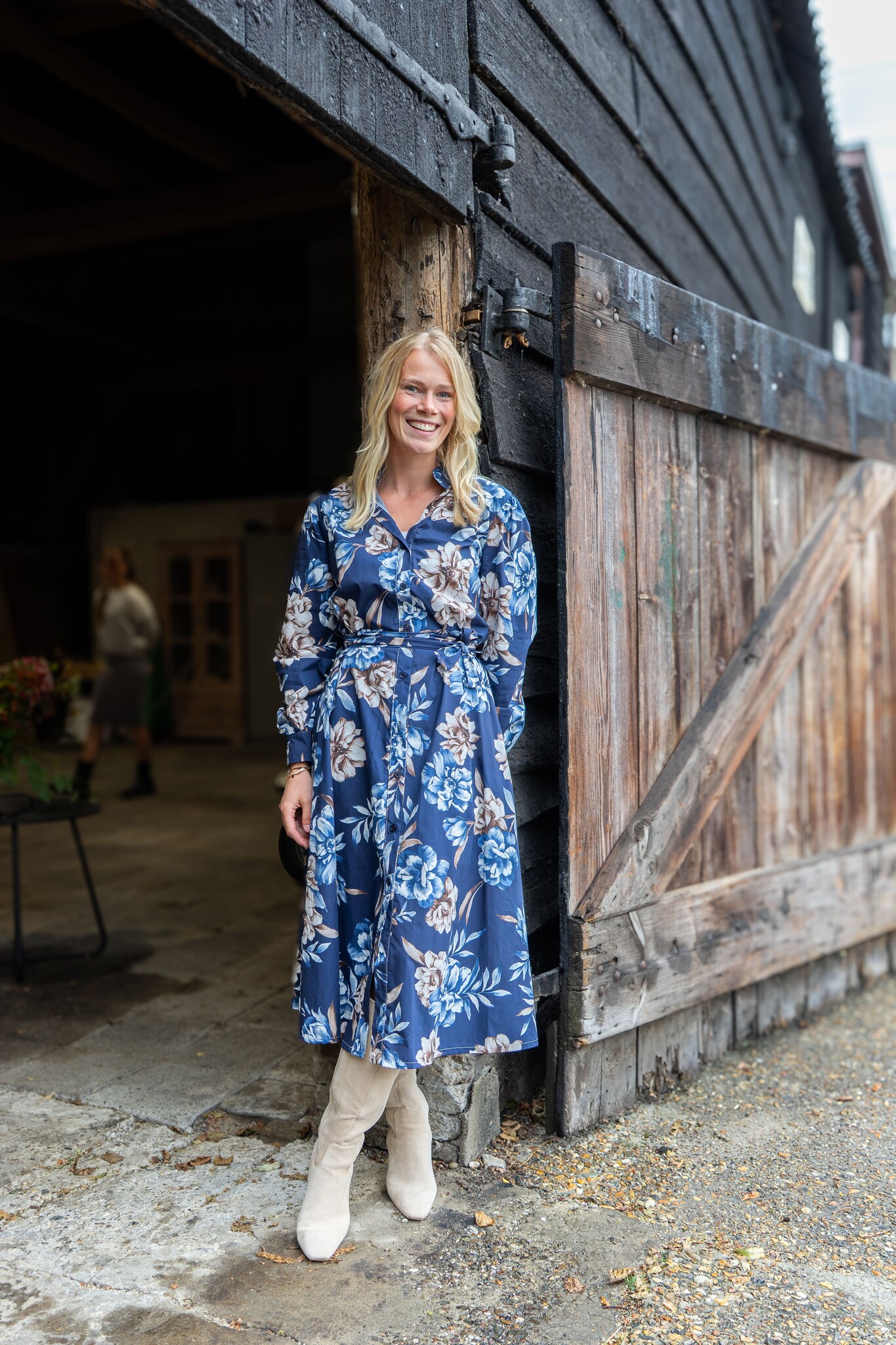 Deze lange doorknoopjurk is een echte blikvanger. Vanuit de taille loopt de rok mooi uit. De jurk is afgewerkt met een subtiel boordje en verfijnde ruches. Perfect om zowel casual met sneakers als stijlvol met hakken te dragen.