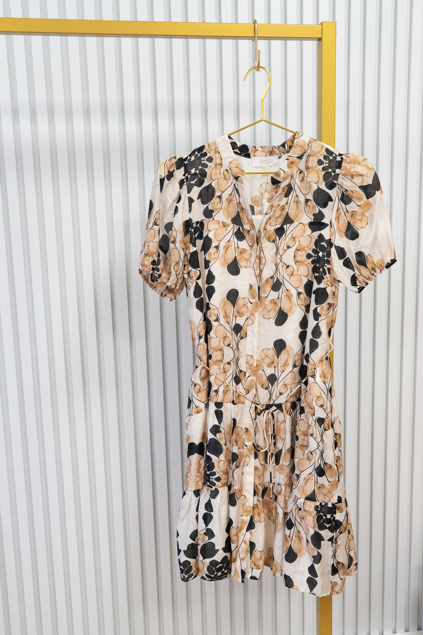Jurk met halsboordje en knoopsluiting. De korte mouwen zijn afgewerkt met elastiek. De jurk heeft een subtiel ceintuurtje en een strook aan de onderzijde. Elegant, comfortabel. Ook perfect voor jonge meiden.