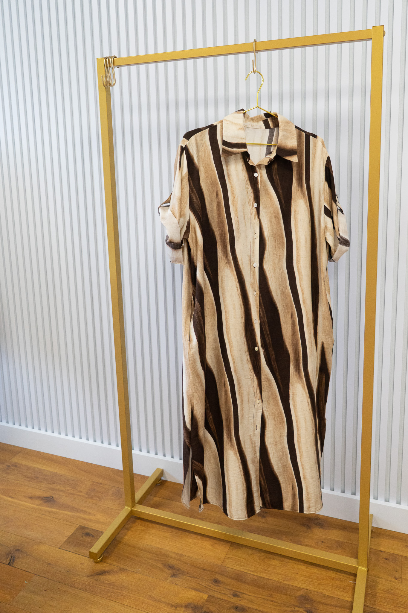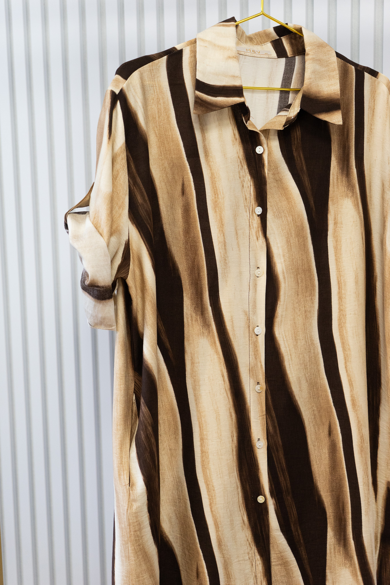 Deze doorknoopjurk heeft een stijlvol diagonaal streeppatroon en driekwartmouwen die je eenvoudig kunt inkorten en en vastzetten met een knoopje. Combineer de jurk met een vest of riem uit onze collectie voor een persoonlijke, complete look.