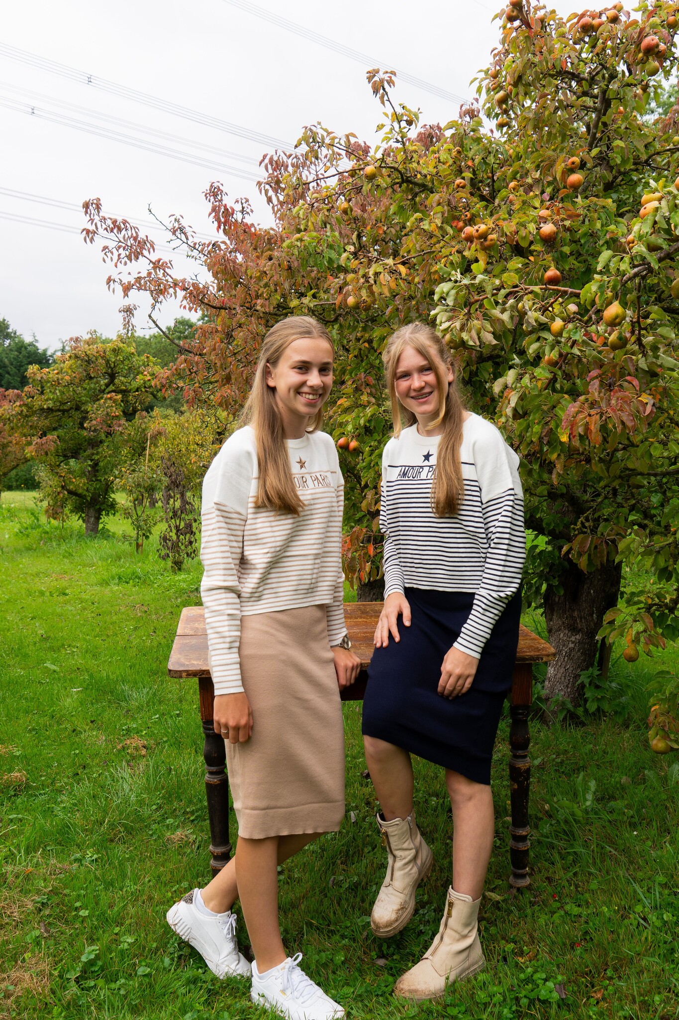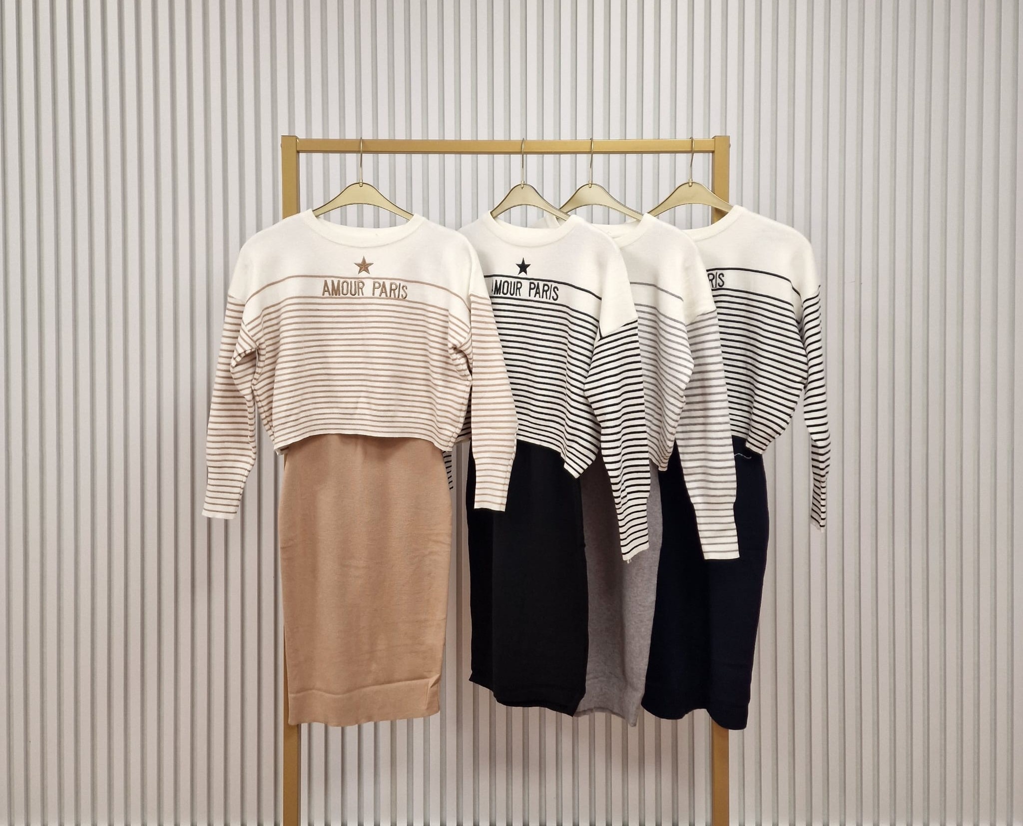 Trendy tweedelig set bestaande uit een effen jurk en een bijpassende trui met streepdessin. Samen vormen ze een speelse maar toch modieuze combinatie, perfect voor zowel schooldagen of andere gelegenheden.