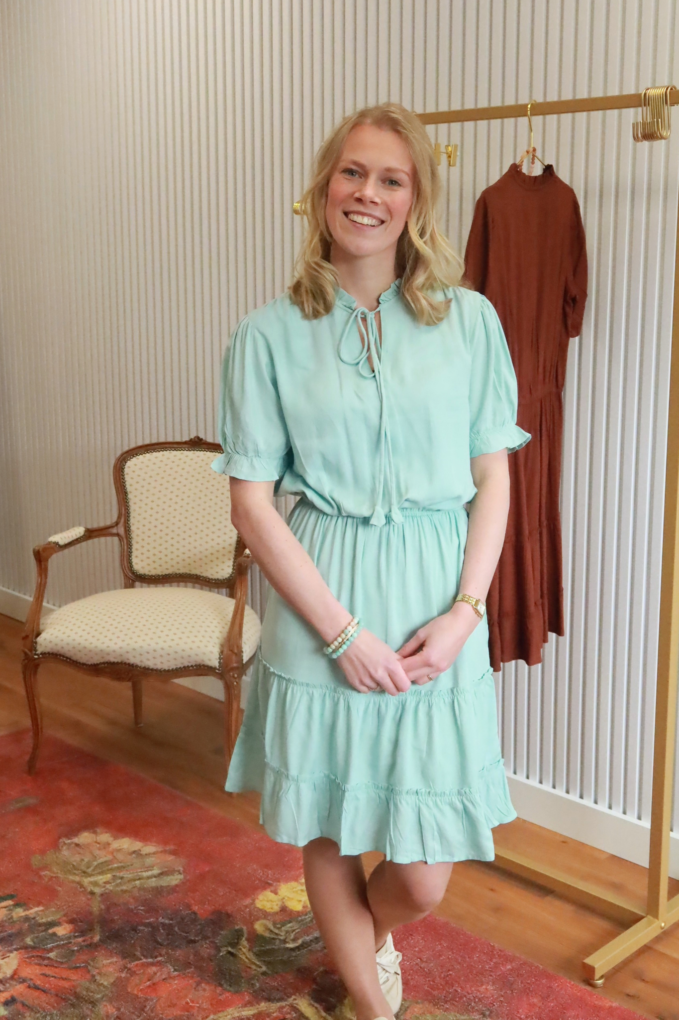 Dit lieve jurkje is afgewerkt met een ruche langs de hals en een strikje voor een charmante touch. De pofmouwtjes met elastiek geven een speels silhouet, terwijl het elastiek in de taille zorgt voor een perfecte pasvorm en optimaal draagcomfort.