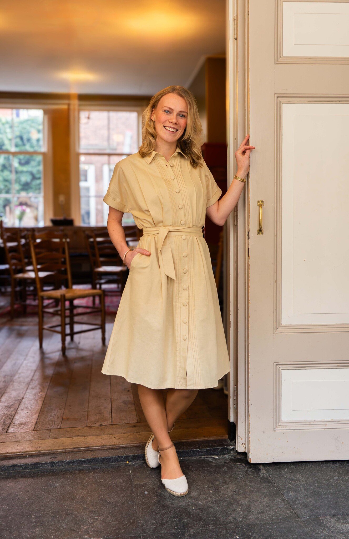 Deze elegante jurk heeft knopen in dezelfde stof voor een verfijnde look en plooitjes in het voorpand voor een speels effect. De strikceintuur accentueert de taille en de praktische steekzakken maken de jurk zowel stijlvol als comfortabel.