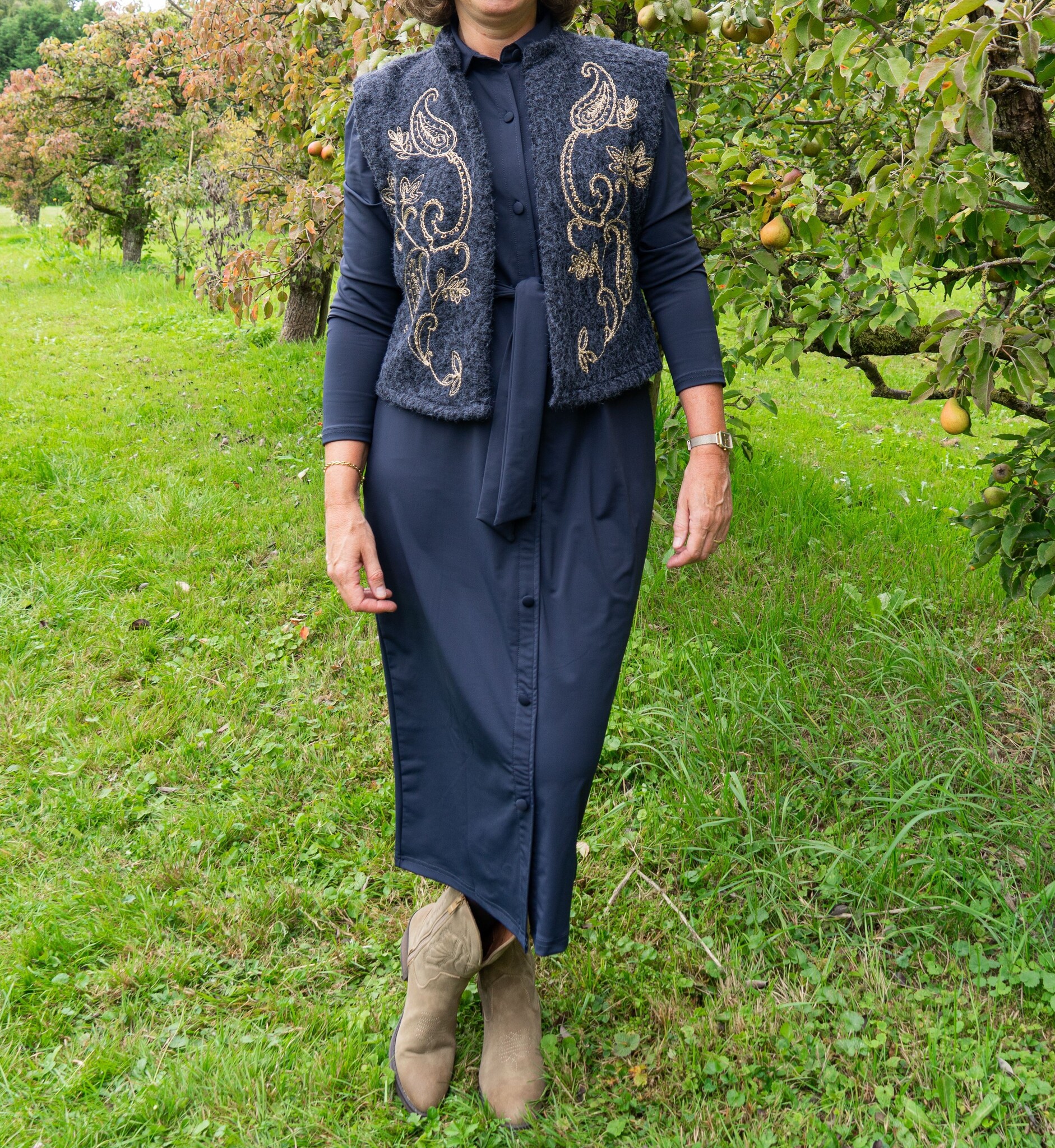 Deze mooie jurk in travelstof heeft een kraag en doorknoopsluiting voor een tijdloze look. De lange mouwen zijn voorzien van plooitjes op de schouder. De jurk heeft een strikceintuur en is ideaal voor diverse gelegenheden en laat zich makkelijk combineren.