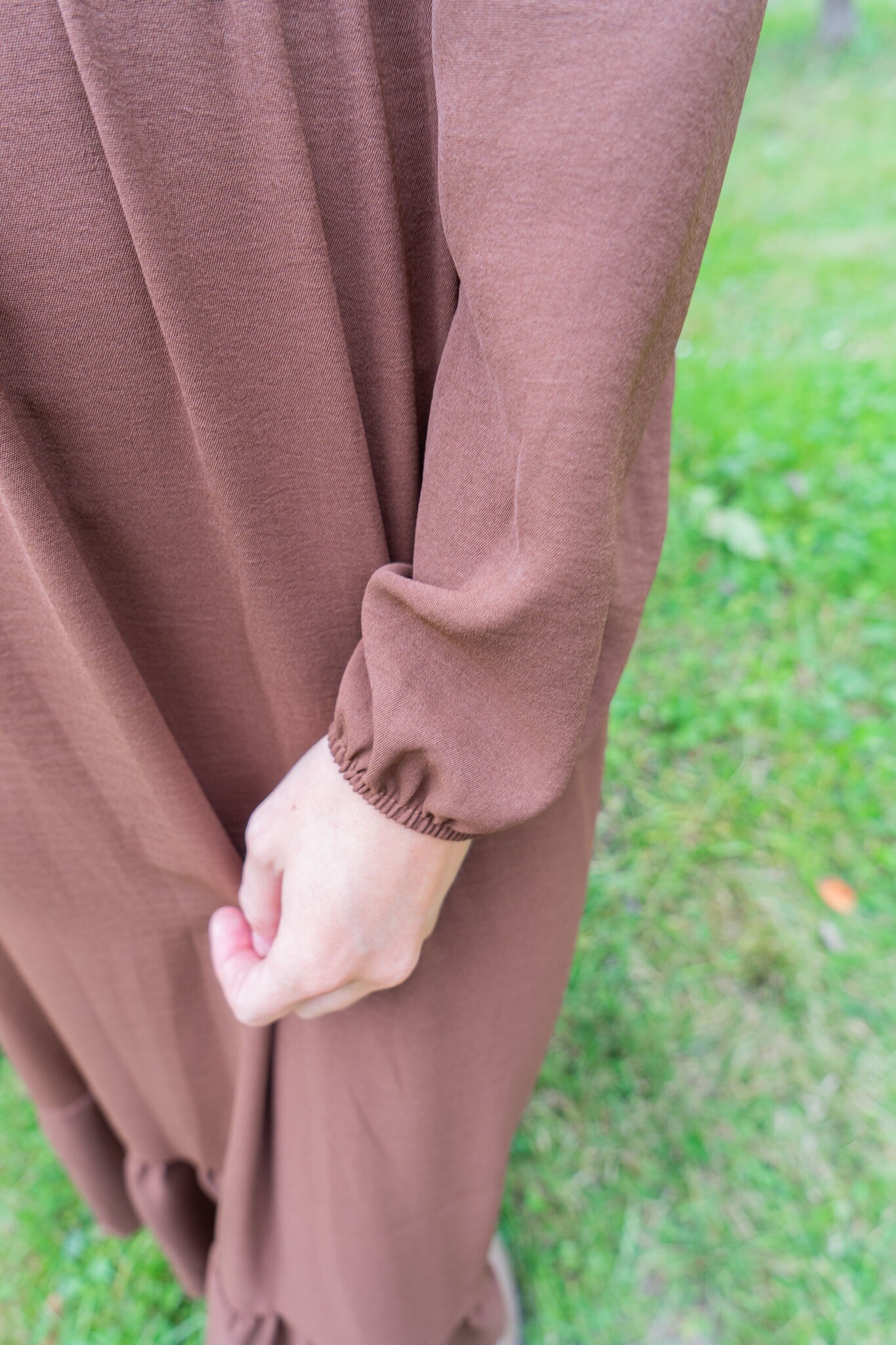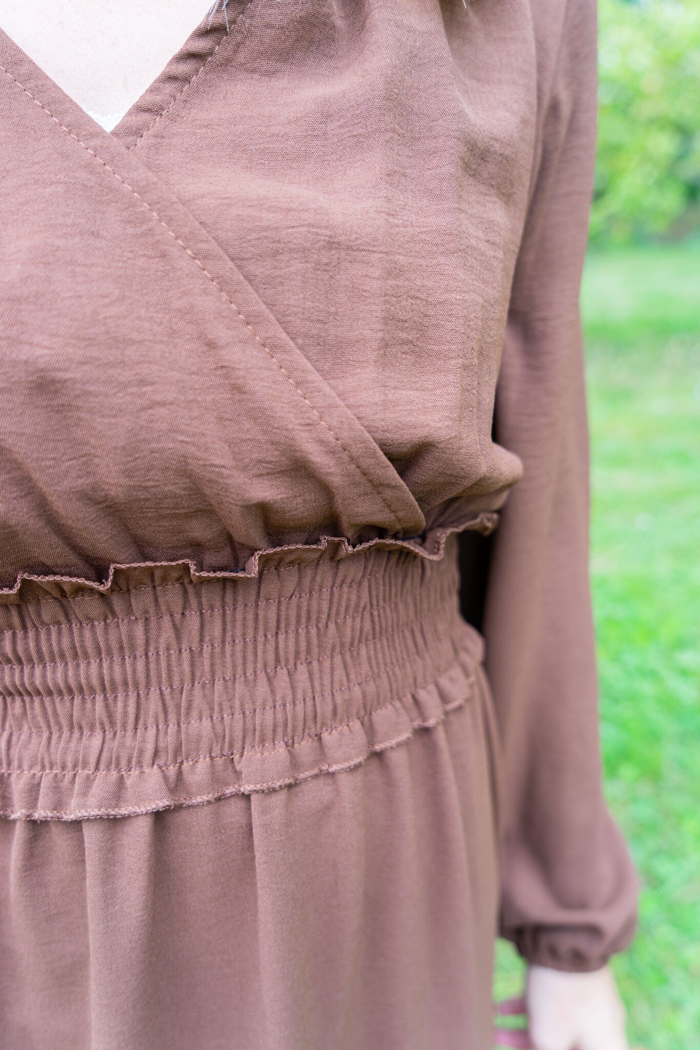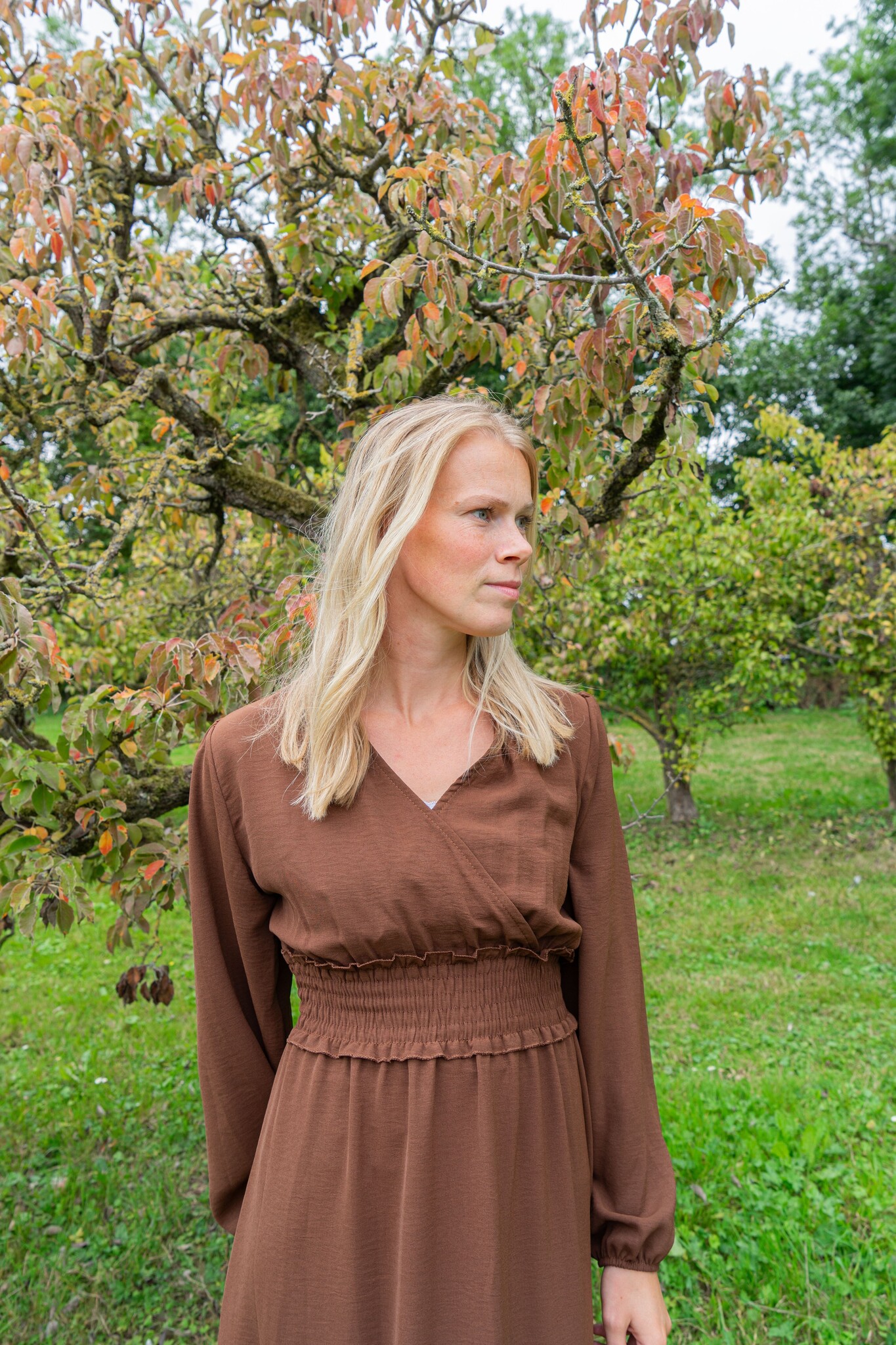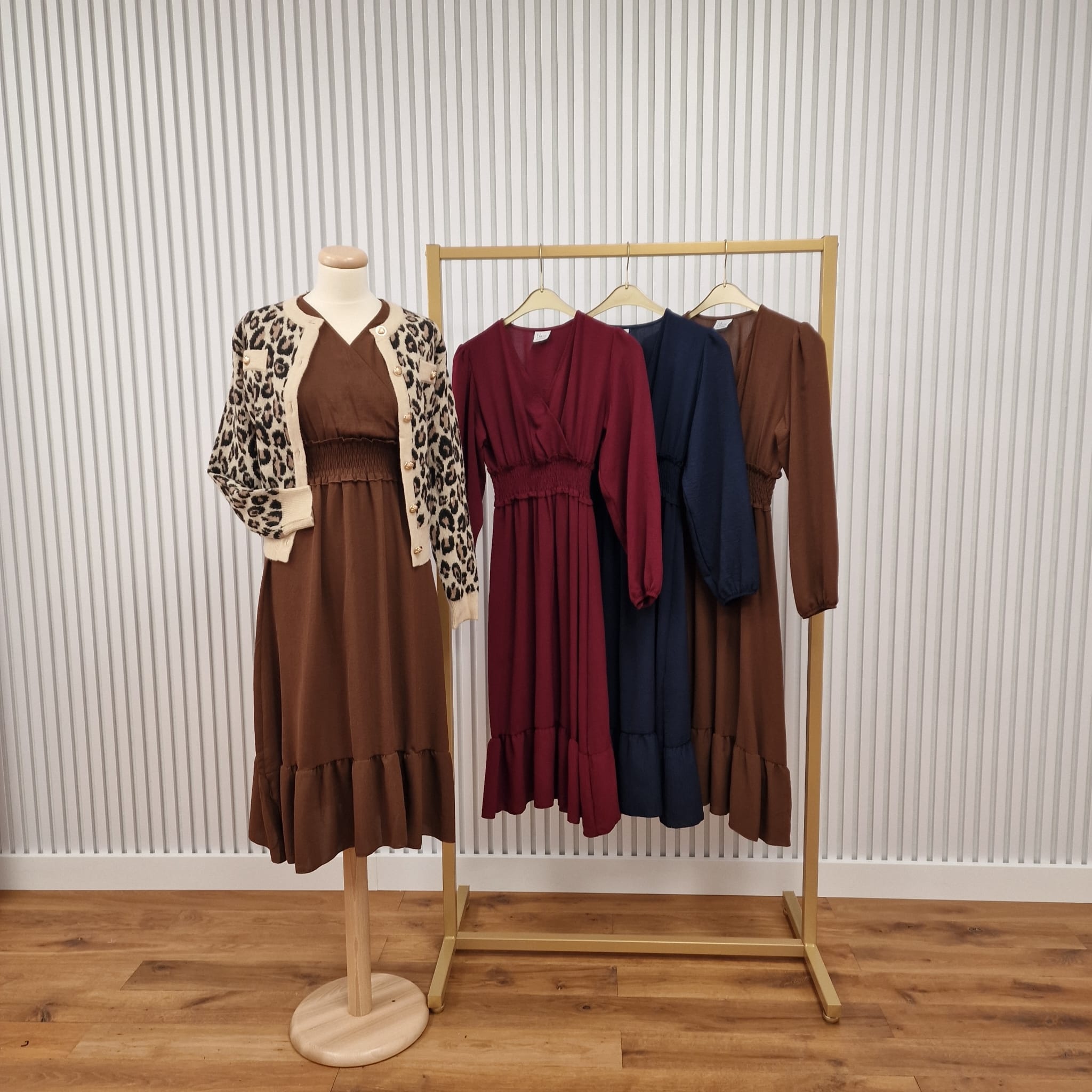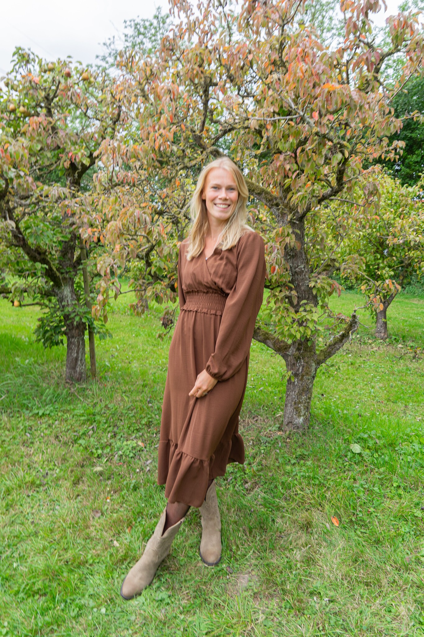 Deze mooie jurk heeft een V-halslijn door de overslag aan de voorzijde. De gesmokte taille is een mooi accent aan de jurk en zorgt voor een comfortabele pasvorm. Aan de onderkant is de jurk afgewerkt met een strook.