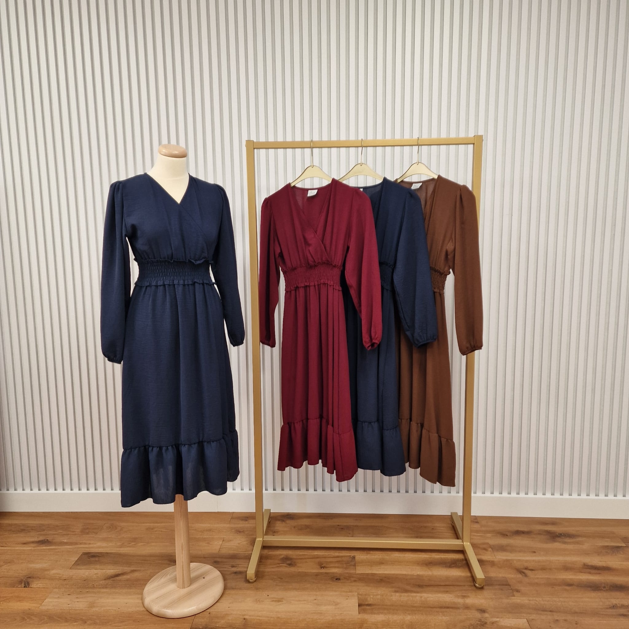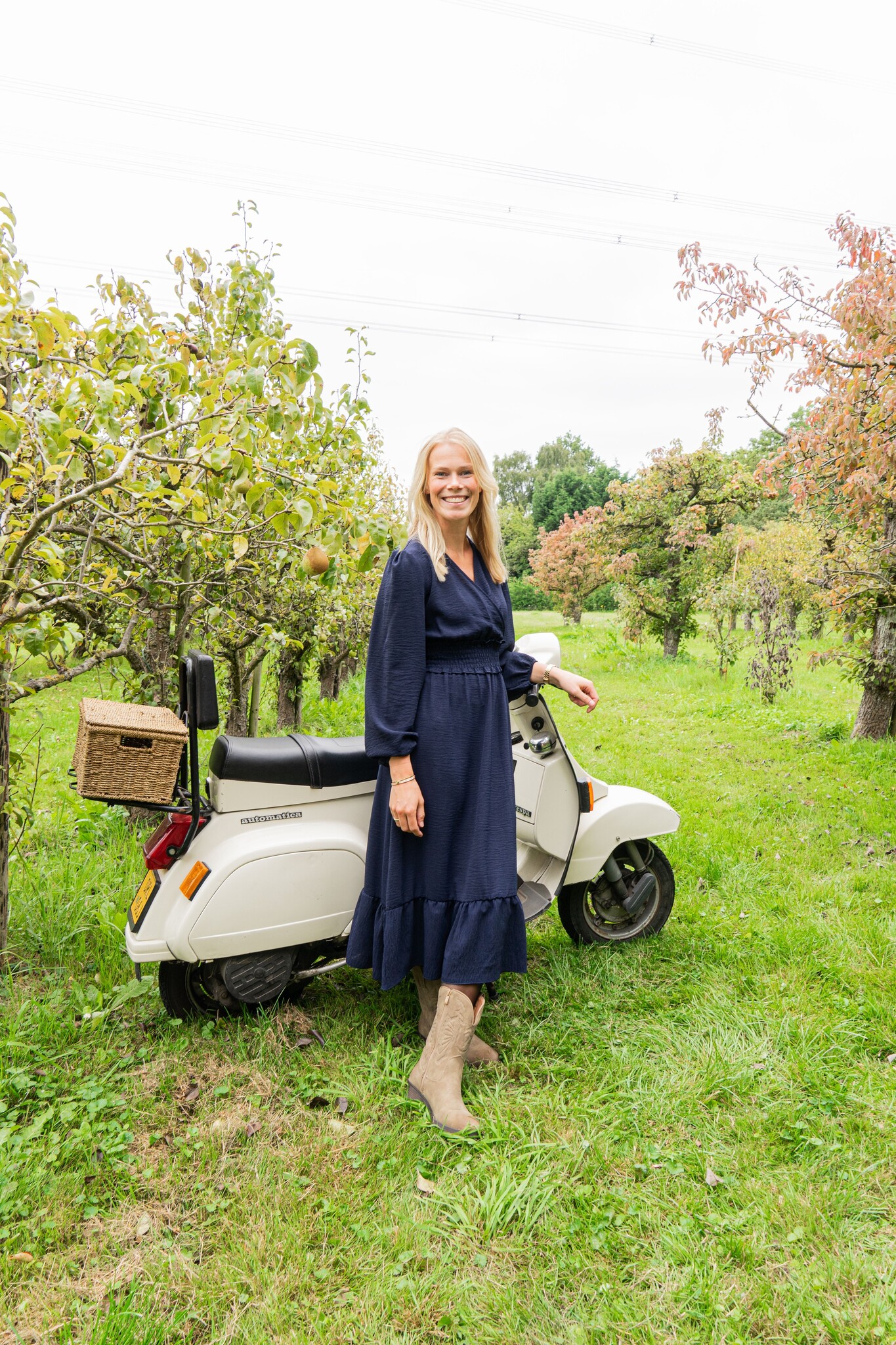 Deze mooie jurk heeft een V-halslijn door de overslag aan de voorzijde. De gesmokte taille is een mooi accent aan de jurk en zorgt voor een comfortabele pasvorm. Aan de onderkant is de jurk afgewerkt met een strook.