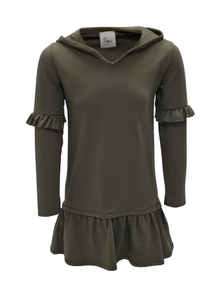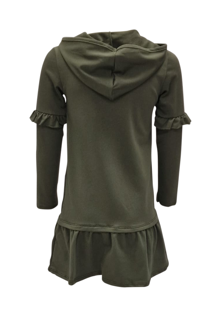 Meisjes jurk in tricot stof met capuchon en afgezet met een strook en op de mouwen een ruche. Fijn draagbaar jurkje. Eventueel te combineren met een bontgiletje uit onze collectie.