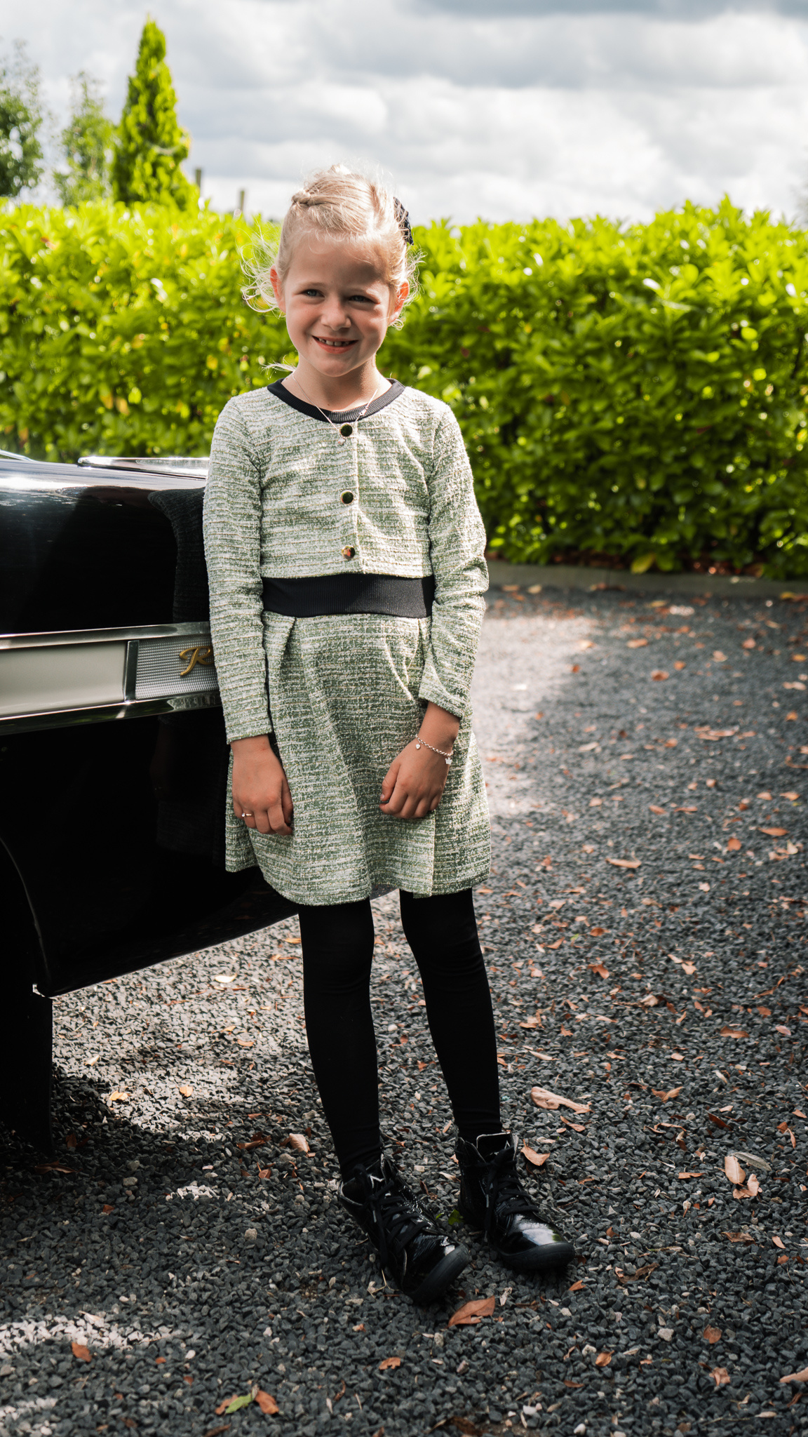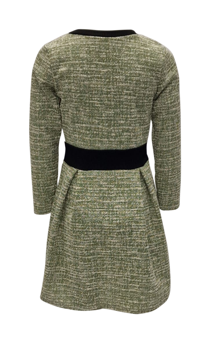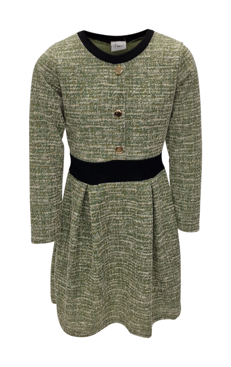 Meisjes jurk in jersey stof met tweed look met op het voorpand 3 sierknoopjes. Langs de hals en in de taille is zwart tricotband aangezet waardoor er een speelse onderbreking ontstaat.