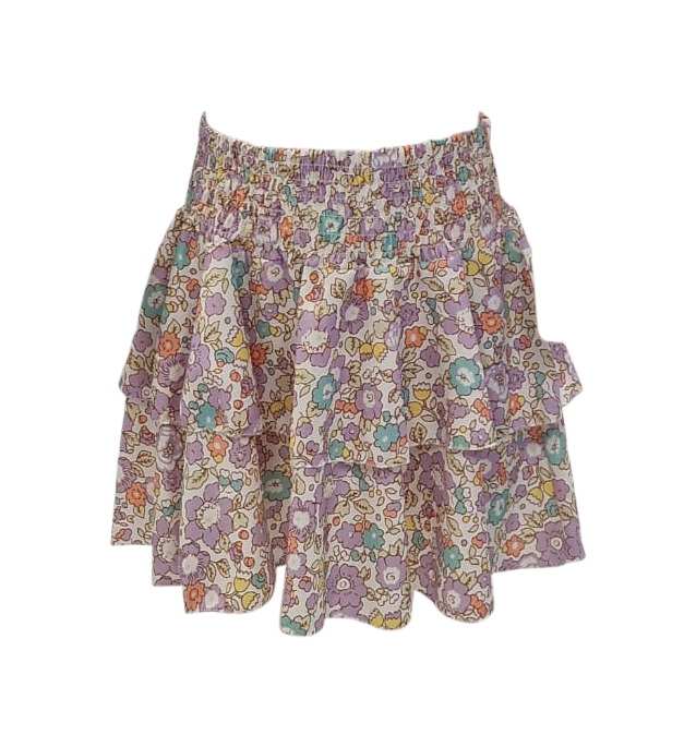 Meisjes rokje met brede elastische taille en twee gelaagde stroken in vrolijke bloemenprint. Leuk te combineren met shirtje Romy uit onze collectie.