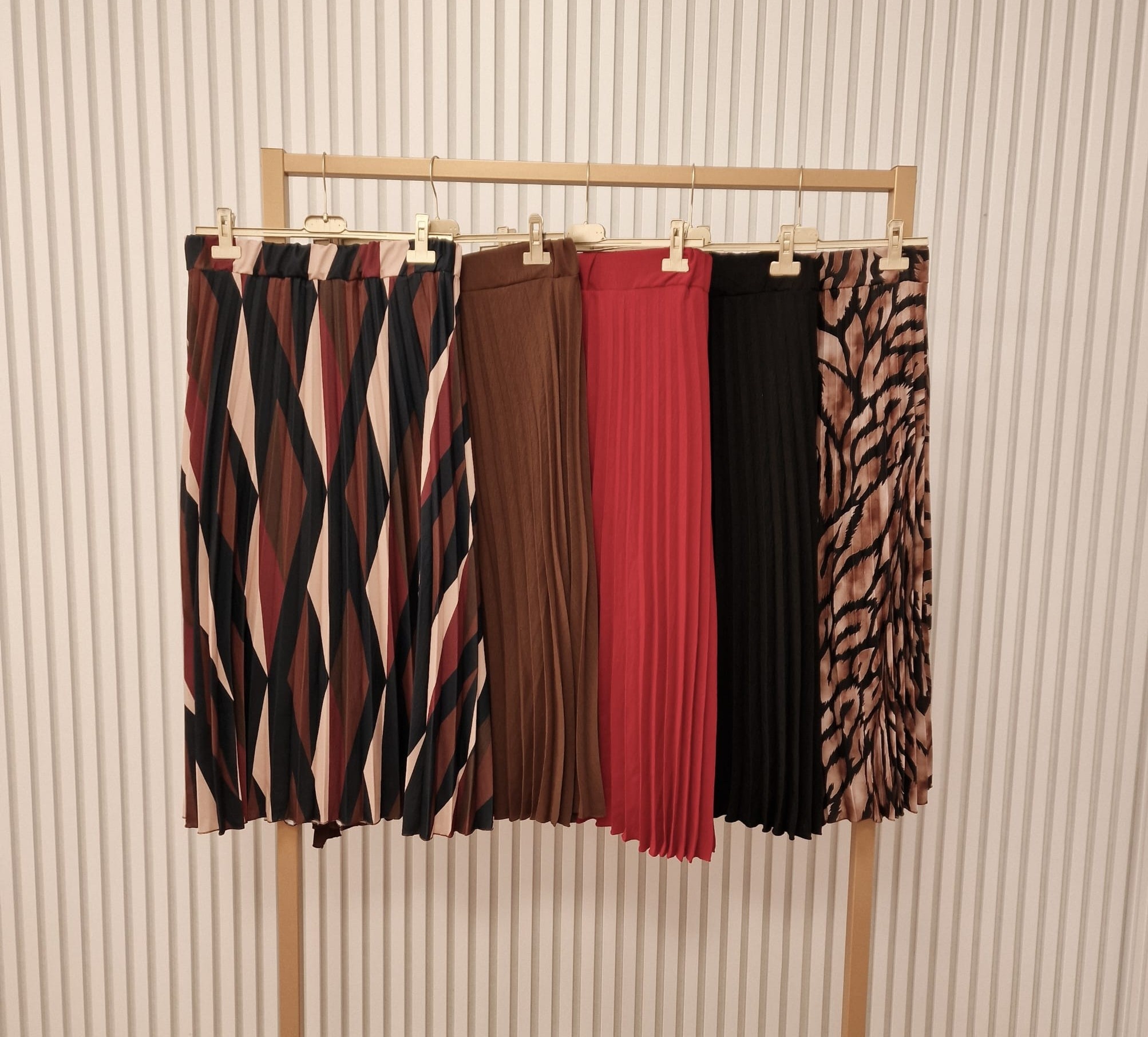 Deze plissé rok combineert comfort met stijl. De elastische tailleband zorgt voor een perfecte pasvorm, terwijl de fijne plooien in de stof een mooie uitstraling geven. De rok valt soepel en heeft een voering.
