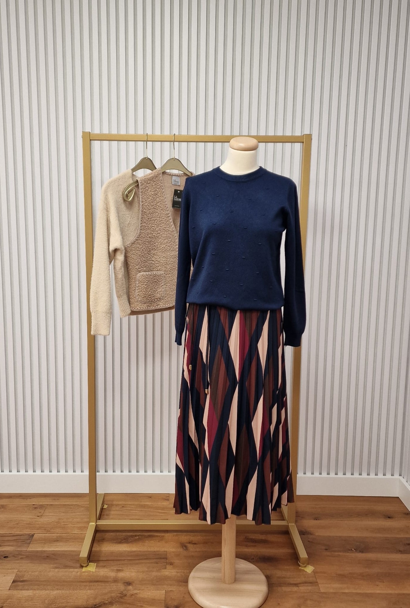 Kleuren in de rok: donkerblauw, bordeaux, bruin, beige, donkerolijf