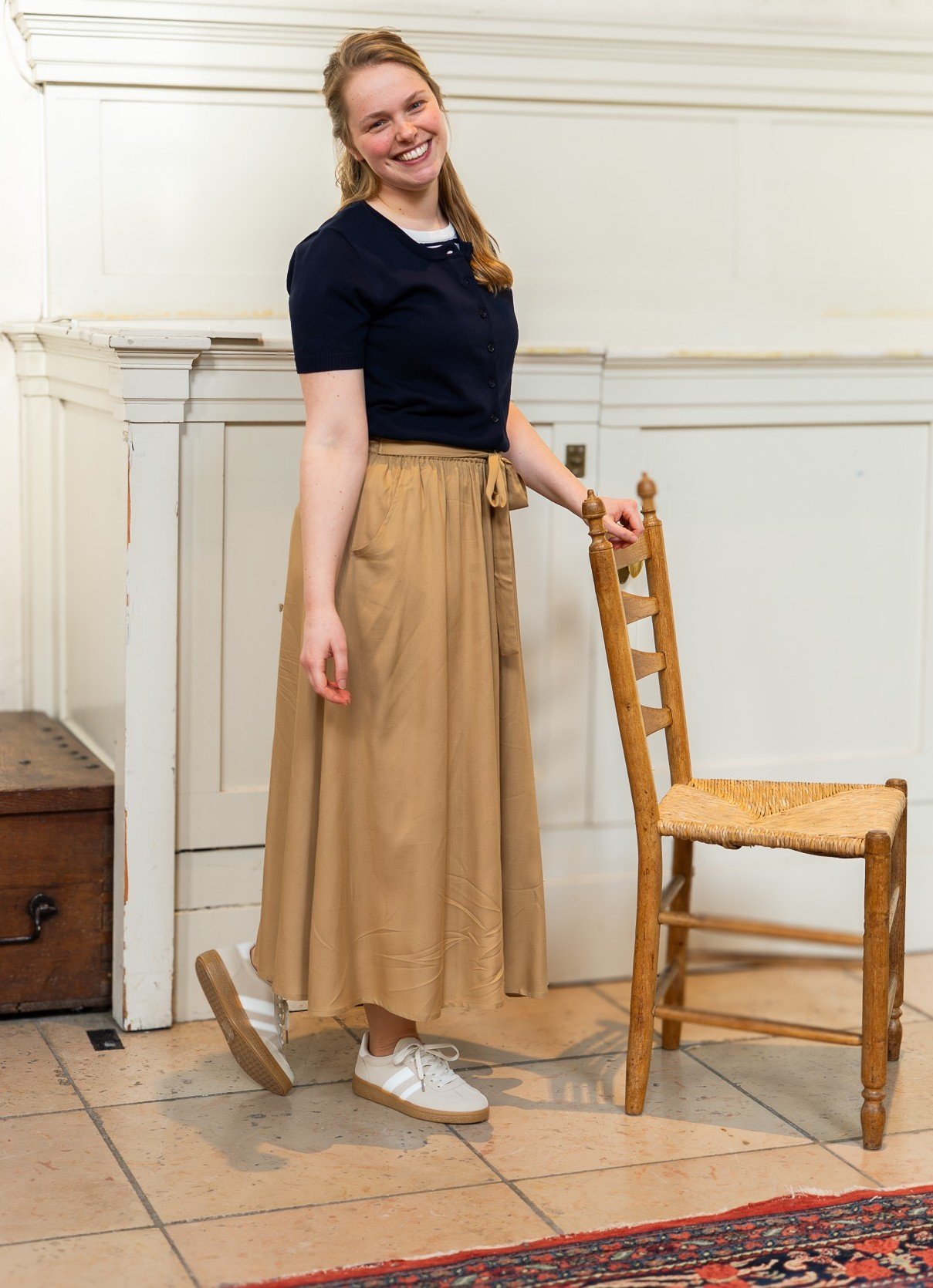 Deze elegante lange rok valt soepel en draagt heerlijk. De elastische tailleband en strikceintuur accentueren de taille, terwijl de praktische steekzakken zorgen voor extra comfort en functionaliteit. Perfect voor moeiteloos draagplezier, elke dag weer.