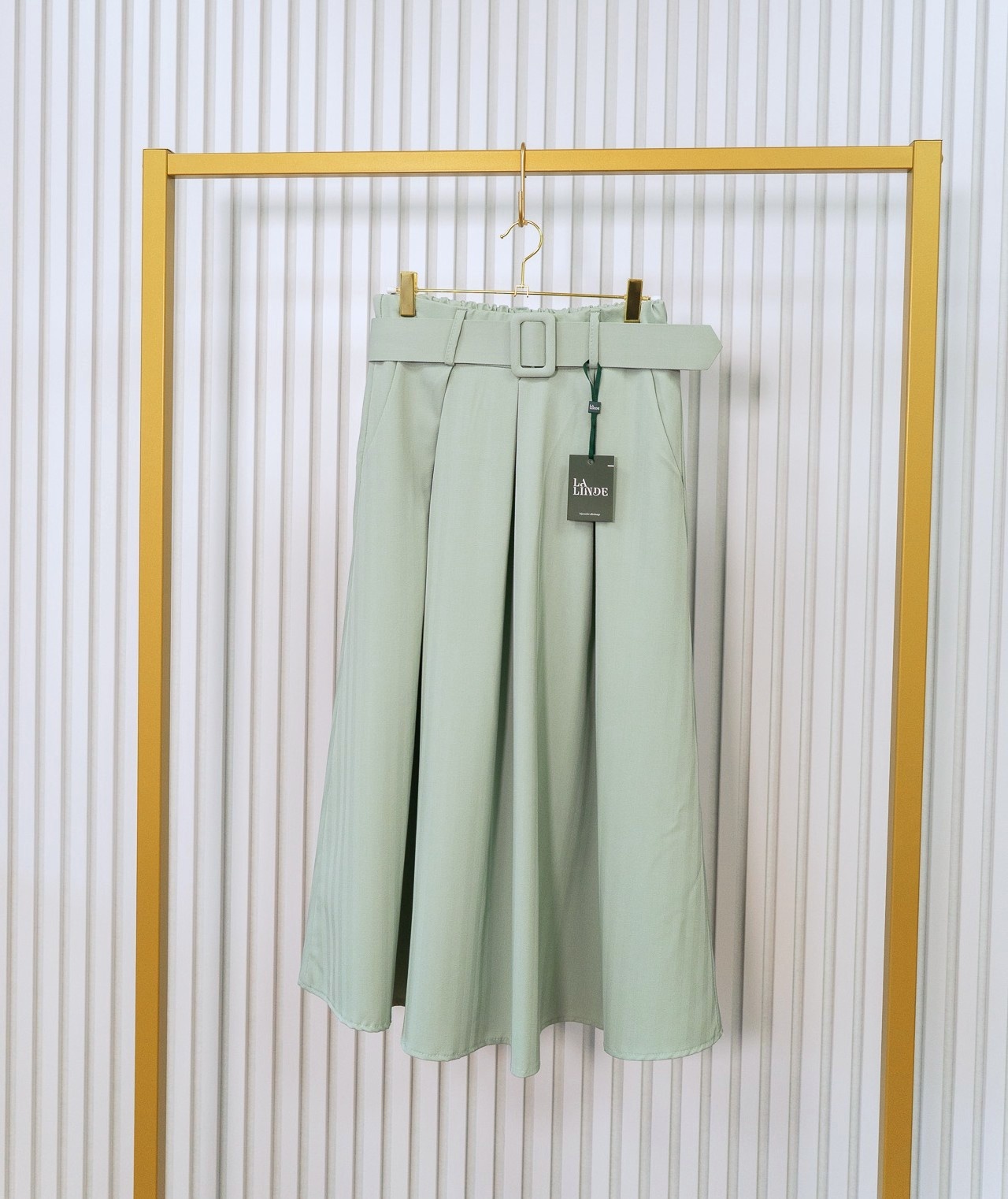 Een elegante rok met losse plooien aan de voorkant en een licht gerimpelde achterkant. De rok is voorzien van handige steekzakken en een bijpassende riem van dezelfde stof. Het ontwerp is afgewerkt met een verfijnd streepjespatroon.