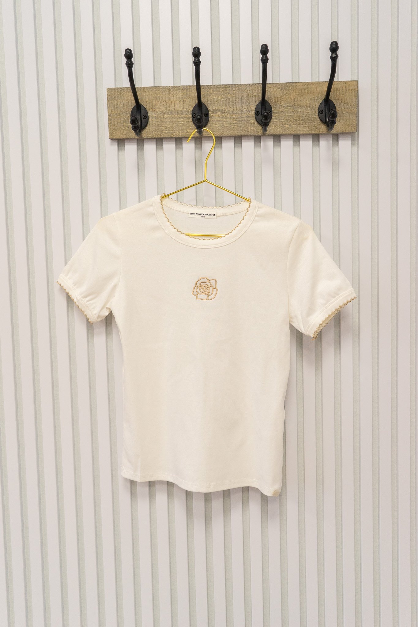 Vrolijk shirt met een schattige roosjesapplicatie en een fijn randje langs de halslijn en mouwen, uitgevoerd in beige. Gemaakt van zacht en comfortabel materiaal, perfect voor jonge meiden en ideaal voor een frisse, speelse look.