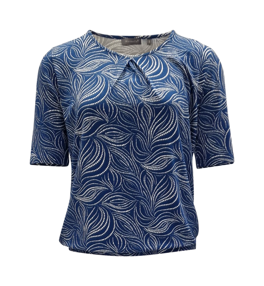 Dames shirt met ronde hals en korte mouw. De onderkant van het shirt is afgewerkt met een elastisch boord. Leuk detail het plooitje bij de hals.