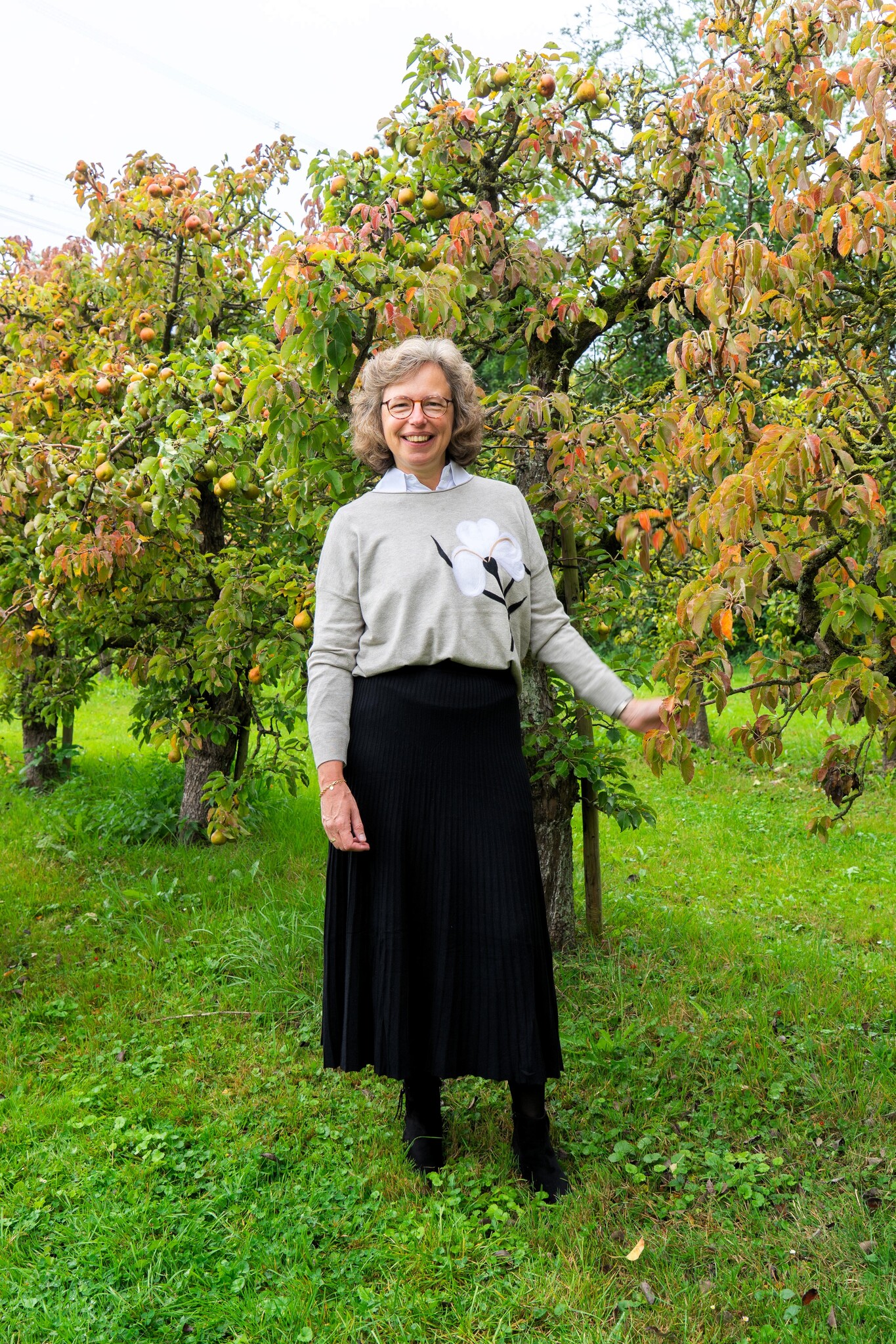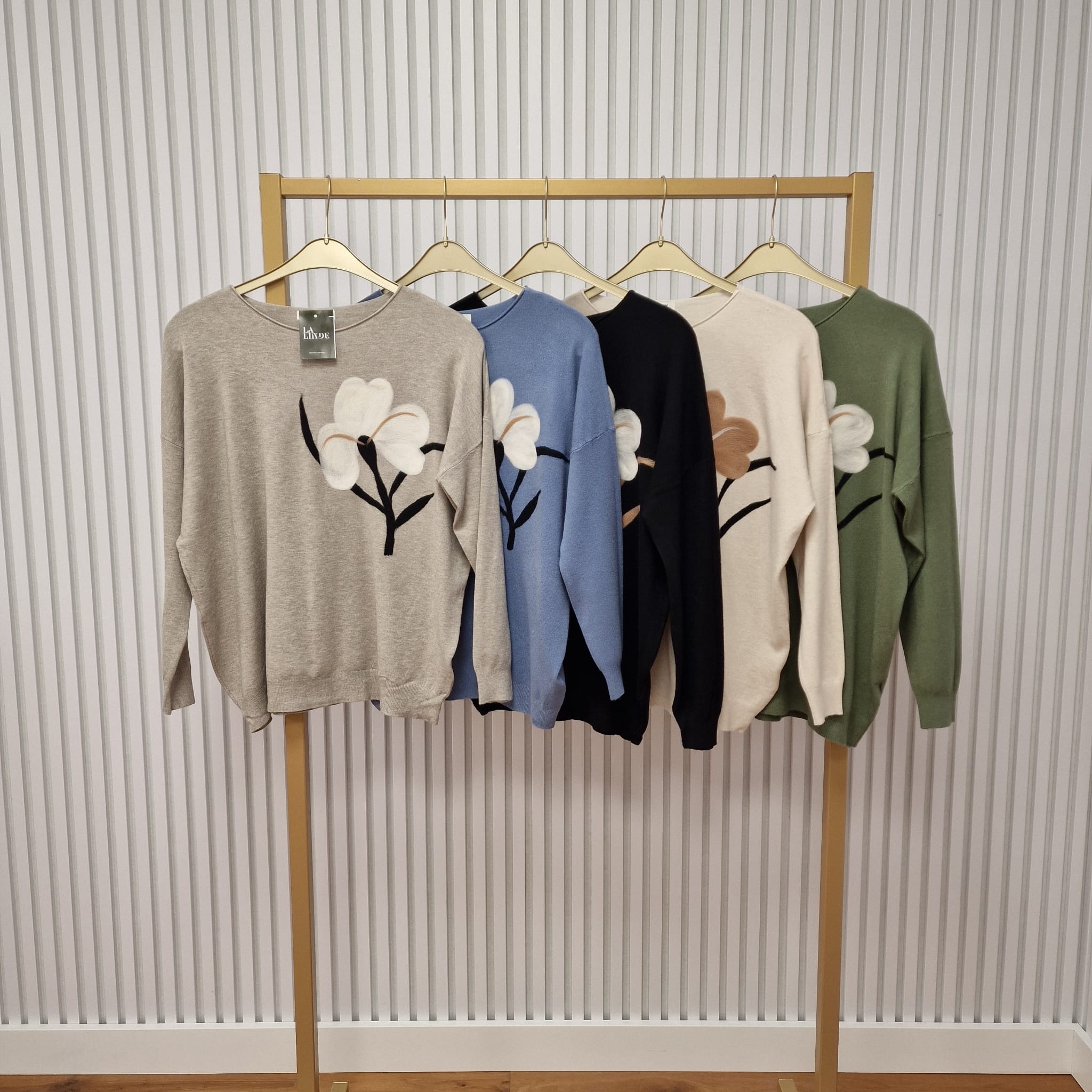 Deze gebreide trui is gemaakt in een zachte, warme stof en heeft een cozy look. De trui is ruim vallend. De vilten bloemapplicatie geeft de trui net dat beetje extra.