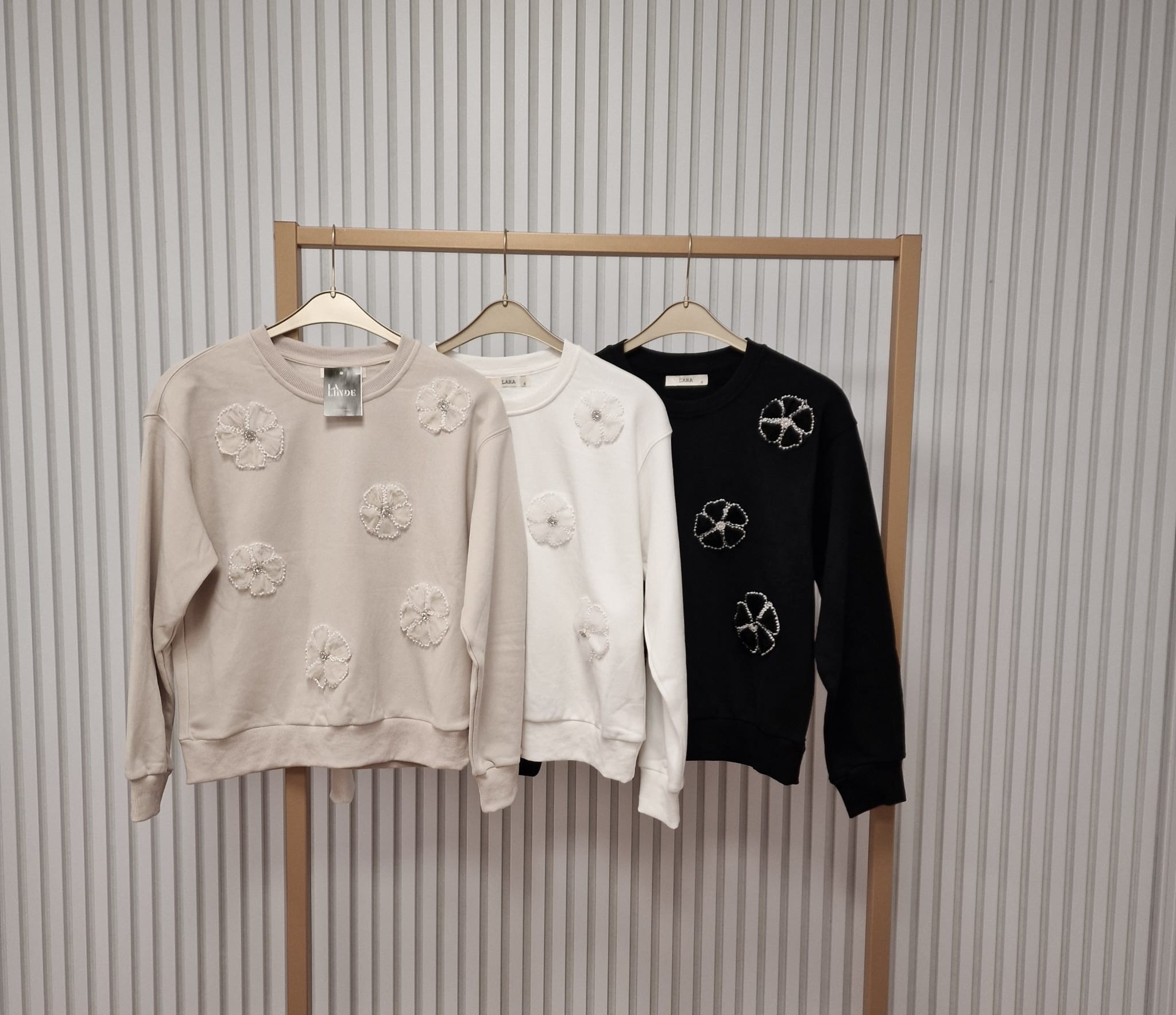 Deze zachte trui van comfortabele sweaterstof valt meteen op door de bloemapplicaties, afgewerkt met kleine pareltjes. Draag ‘m casual of stijlvol.