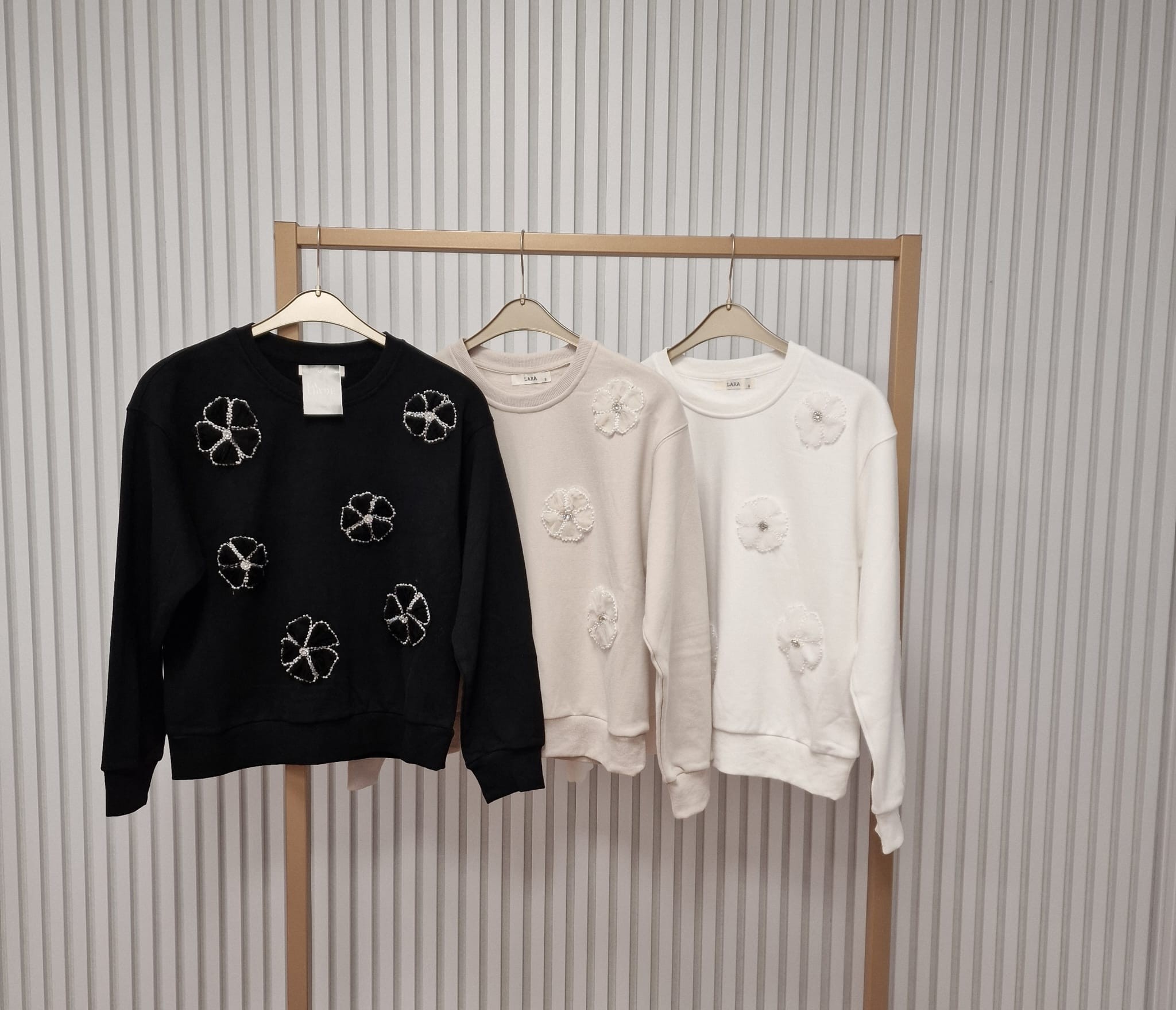 Deze zachte trui van comfortabele sweaterstof valt meteen op door de bloemapplicaties, afgewerkt met kleine pareltjes. Draag ‘m casual of stijlvol.