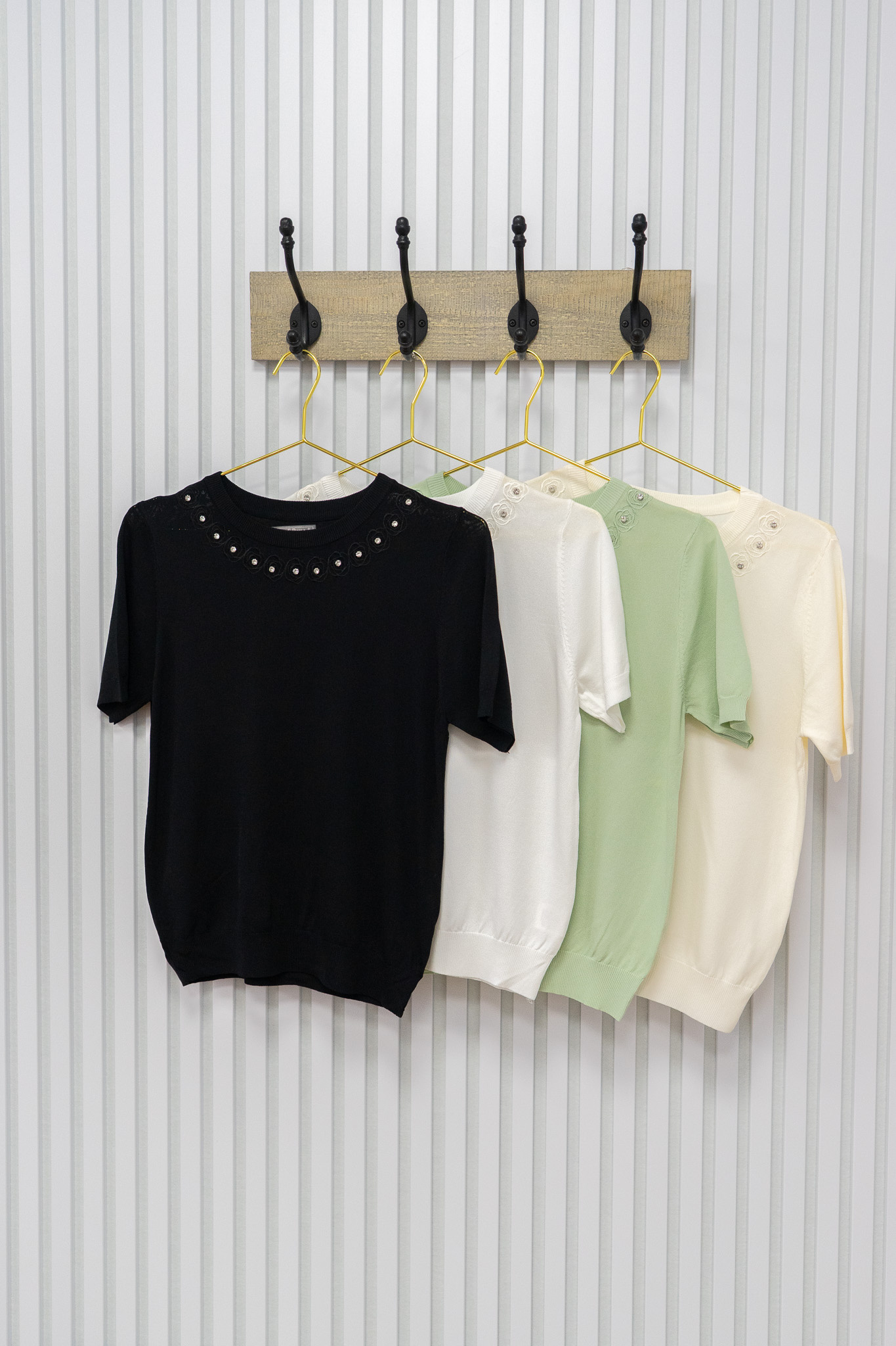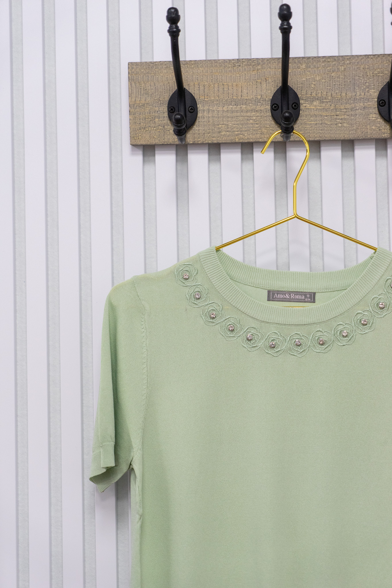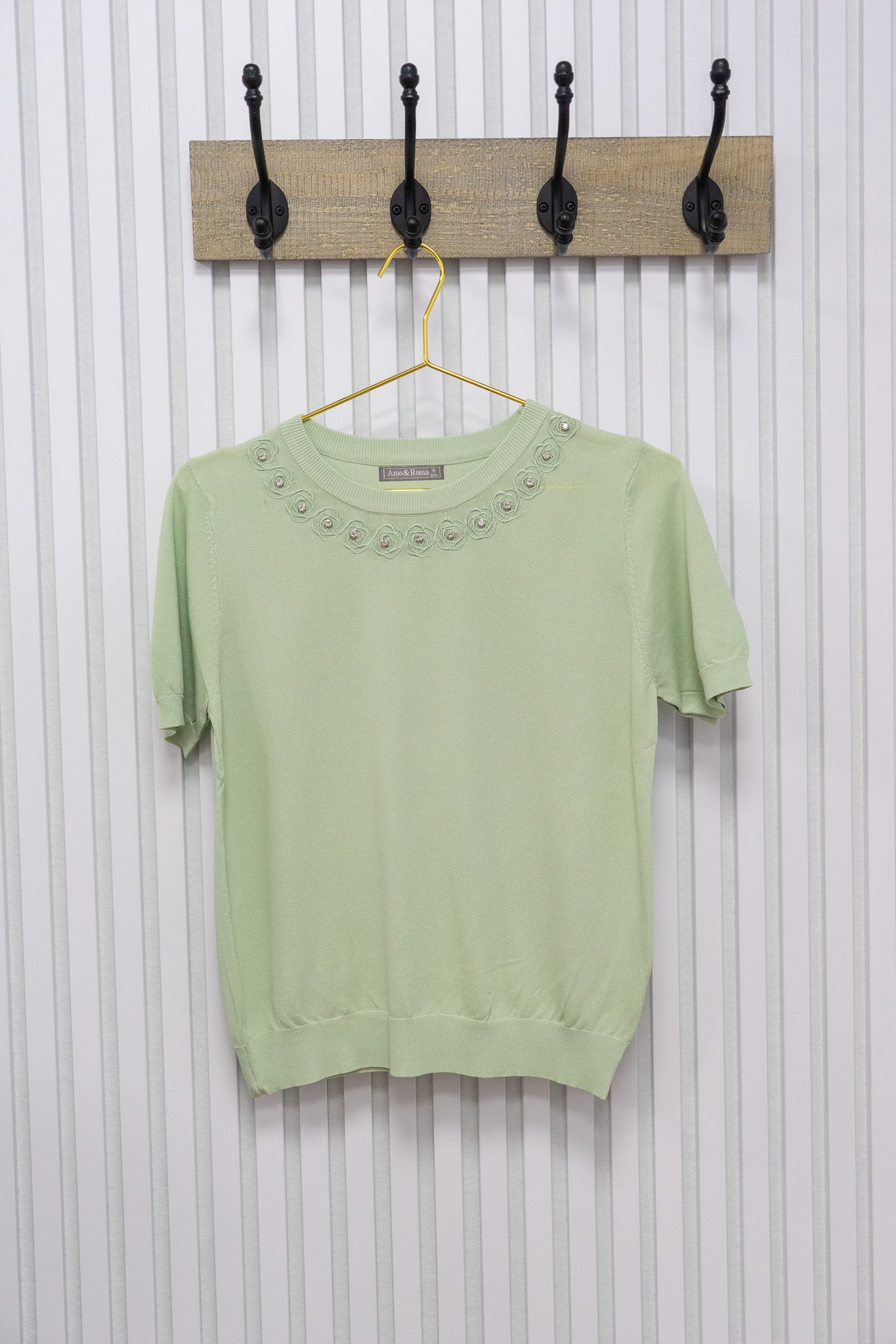 Fijn zomers truitje met korte mouwen, gemaakt van zacht, comfortabel materiaal. De halslijn is subtiel versierd met schattige roosjes voor een speels accent. Een perfecte aanvulling op elke zomergarderobe en eenvoudig te combineren.