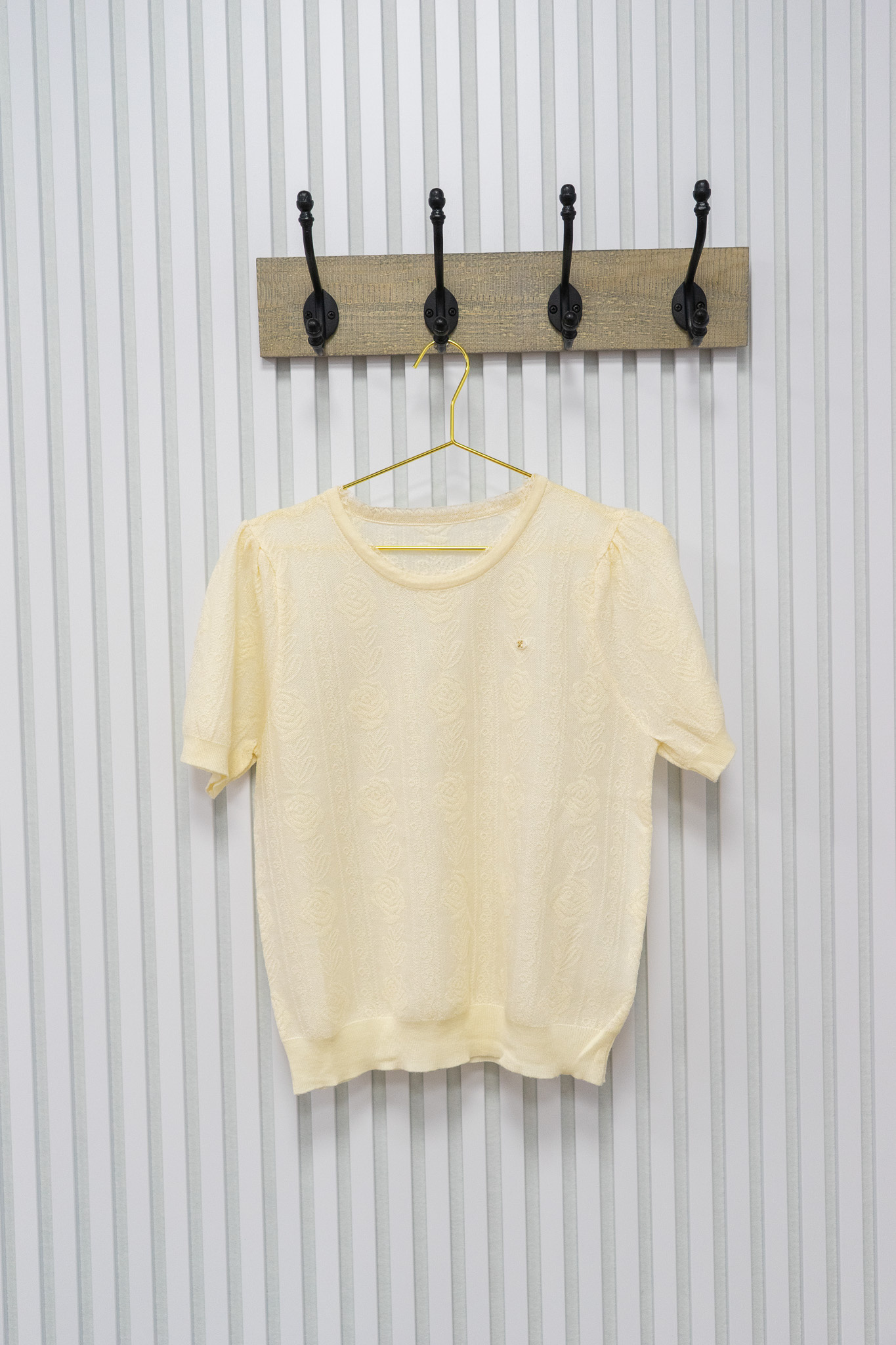 Truitje uitgevoerd in een mooie stof met subtiele glans en een charmant roosjespatroon. Het halsboordje is afgewerkt met een fijn kantje aan de binnenkant. Comfortabel en stijlvol, perfect voor zowel casual als feestelijke looks.