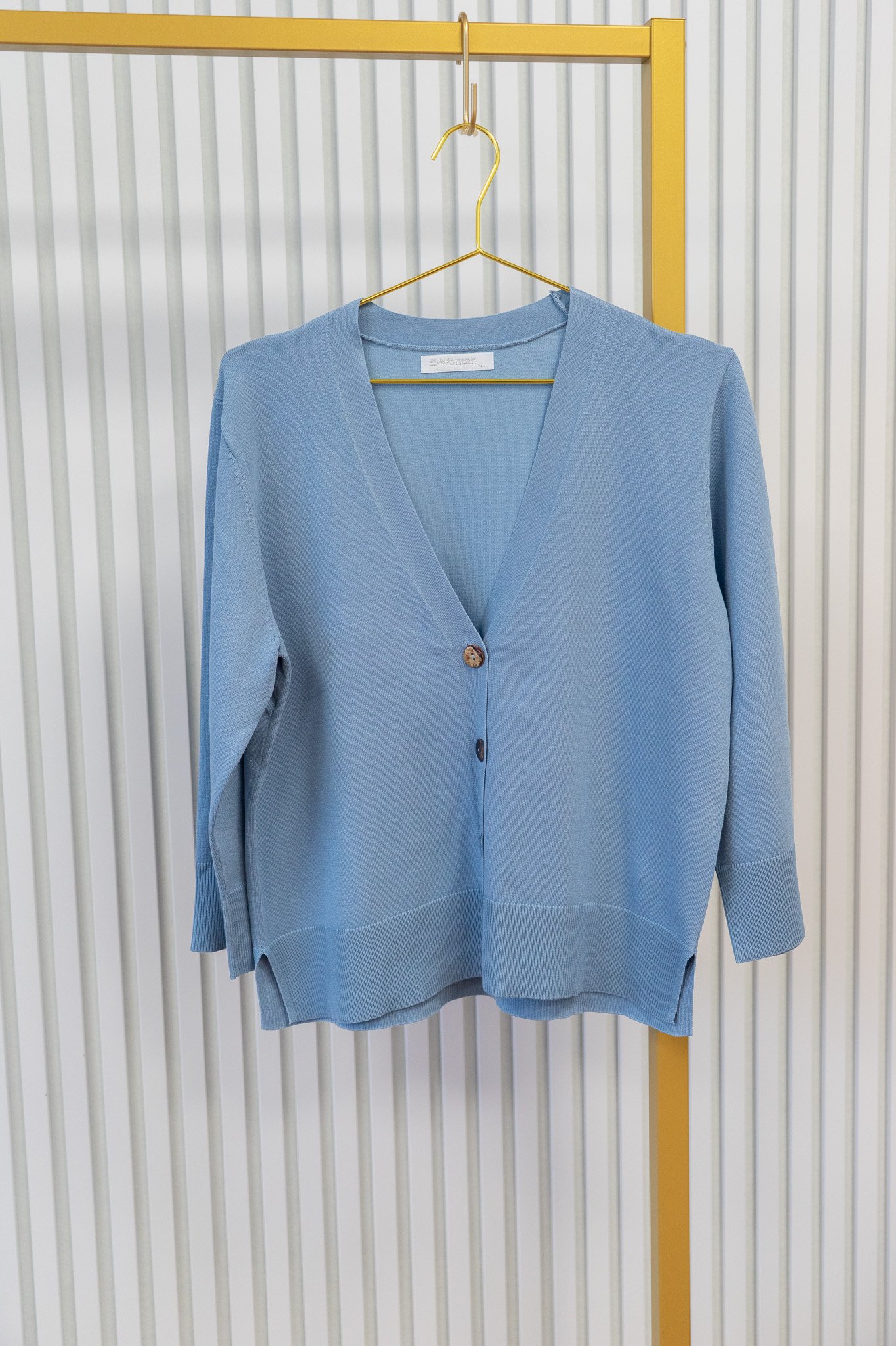 Damesvest met V-hals en knoopsluiting, uitgevoerd met 3/4-mouwen en brede boorden voor een stijlvolle afwerking. Gemaakt van zacht en comfortabel materiaal, ideaal als veelzijdig laagje voor zowel casual als chique combinaties.