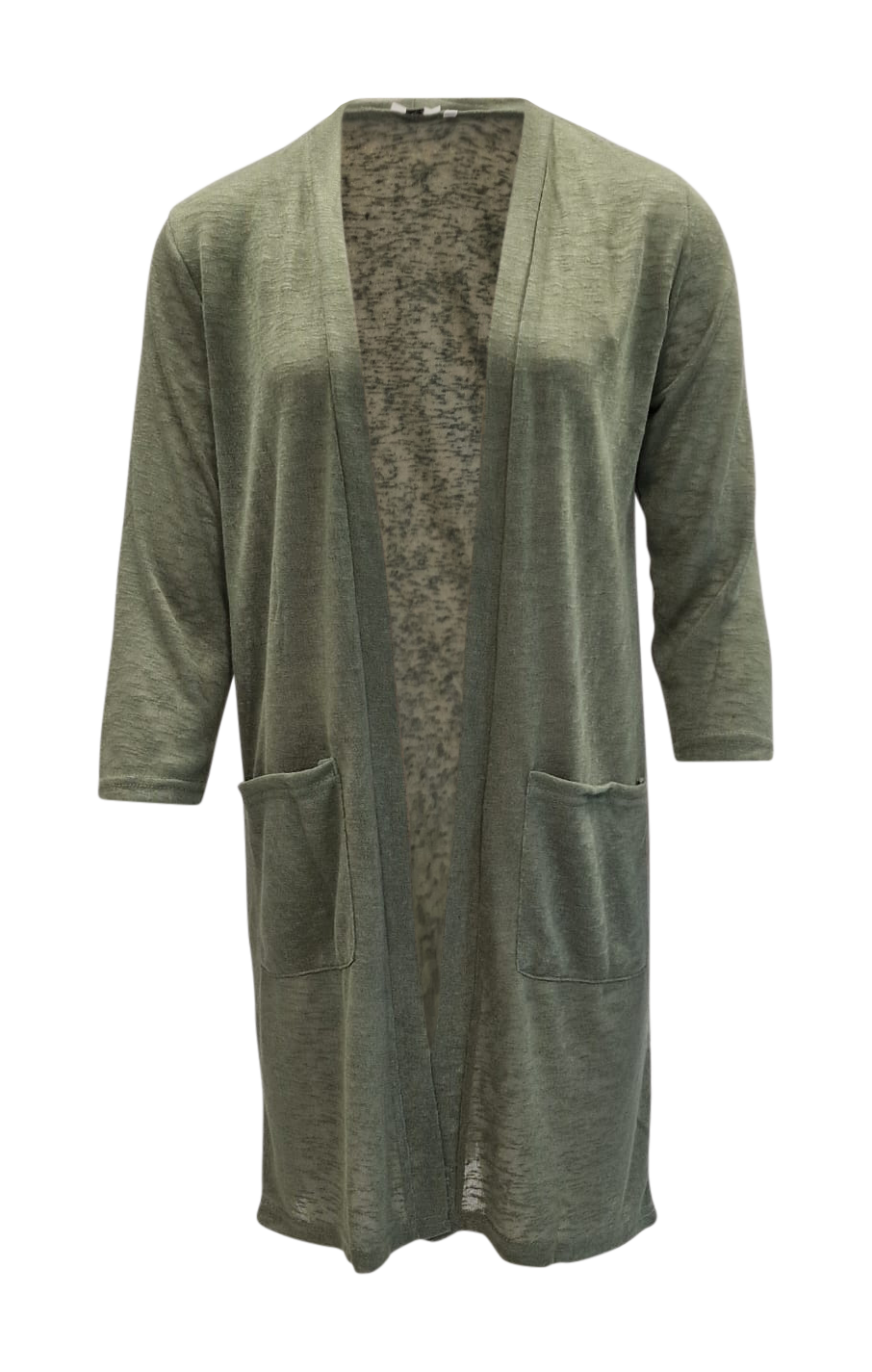 Damesvest halflang in mooie dunne en zachte kwaliteit. Draagt comfortabel. Het vest heeft een driekwart mouw, mooie halslijn en zakjes. In verschillende kleuren verkrijgbaar.