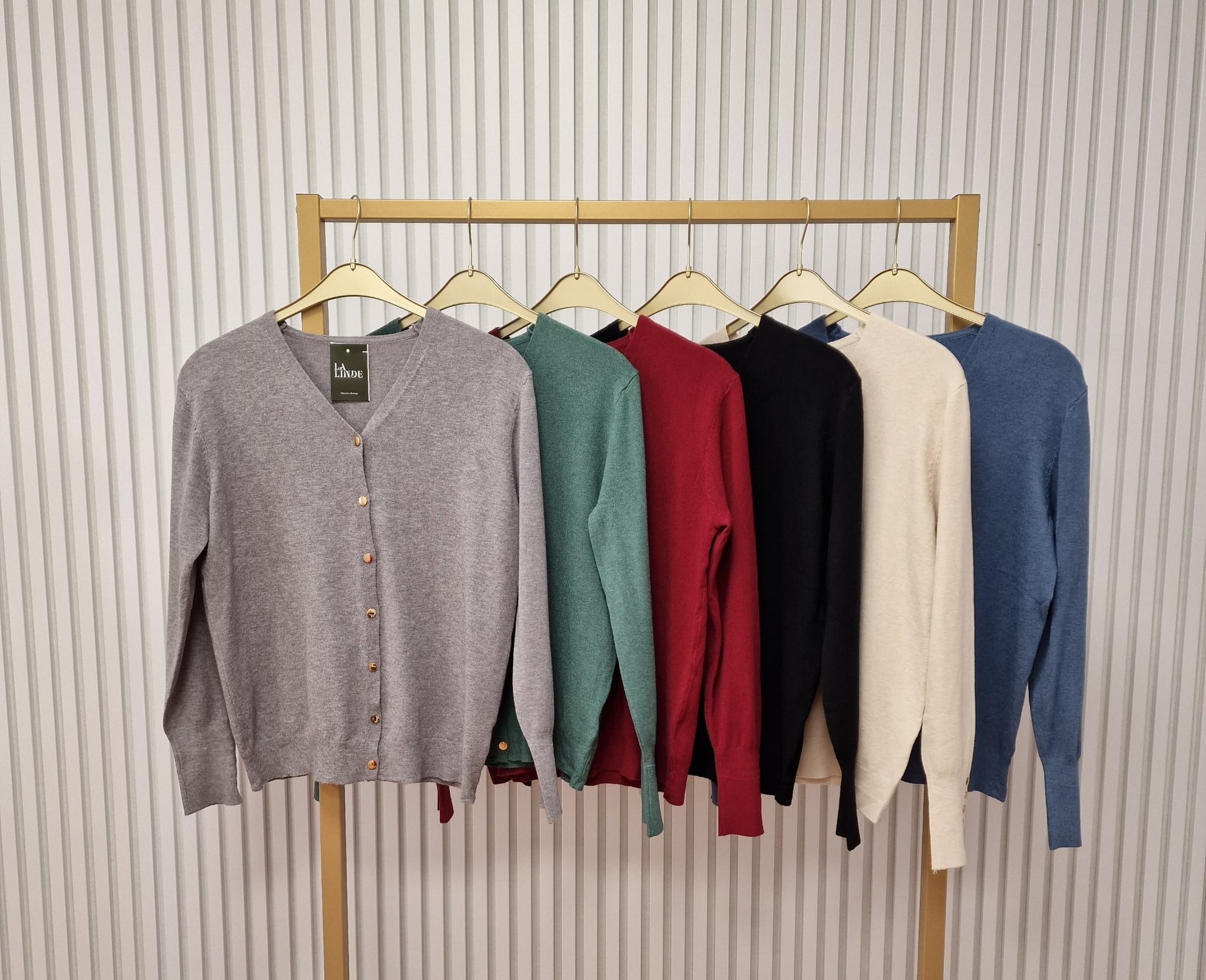 Basic damesvestje met een V-hals en een knoopsluiting met koperen knoopjes. Ook op de mouwen zit een koperen knoopje als detail. Gemaakt van een zachte, comfortabele stof en makkelijk te combineren.