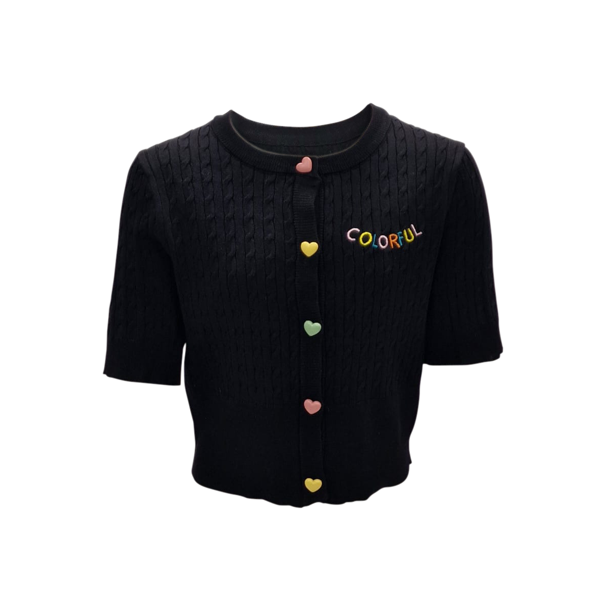Super lief vestje voor jonge meiden. Het vestje is fijn gebreid in kabel patroon. Het vestje heeft een korte mouw, knoopjes in frisse kleurtjes en een applicatie met de tekst 'colorful' in dezelfde kleurtjes.